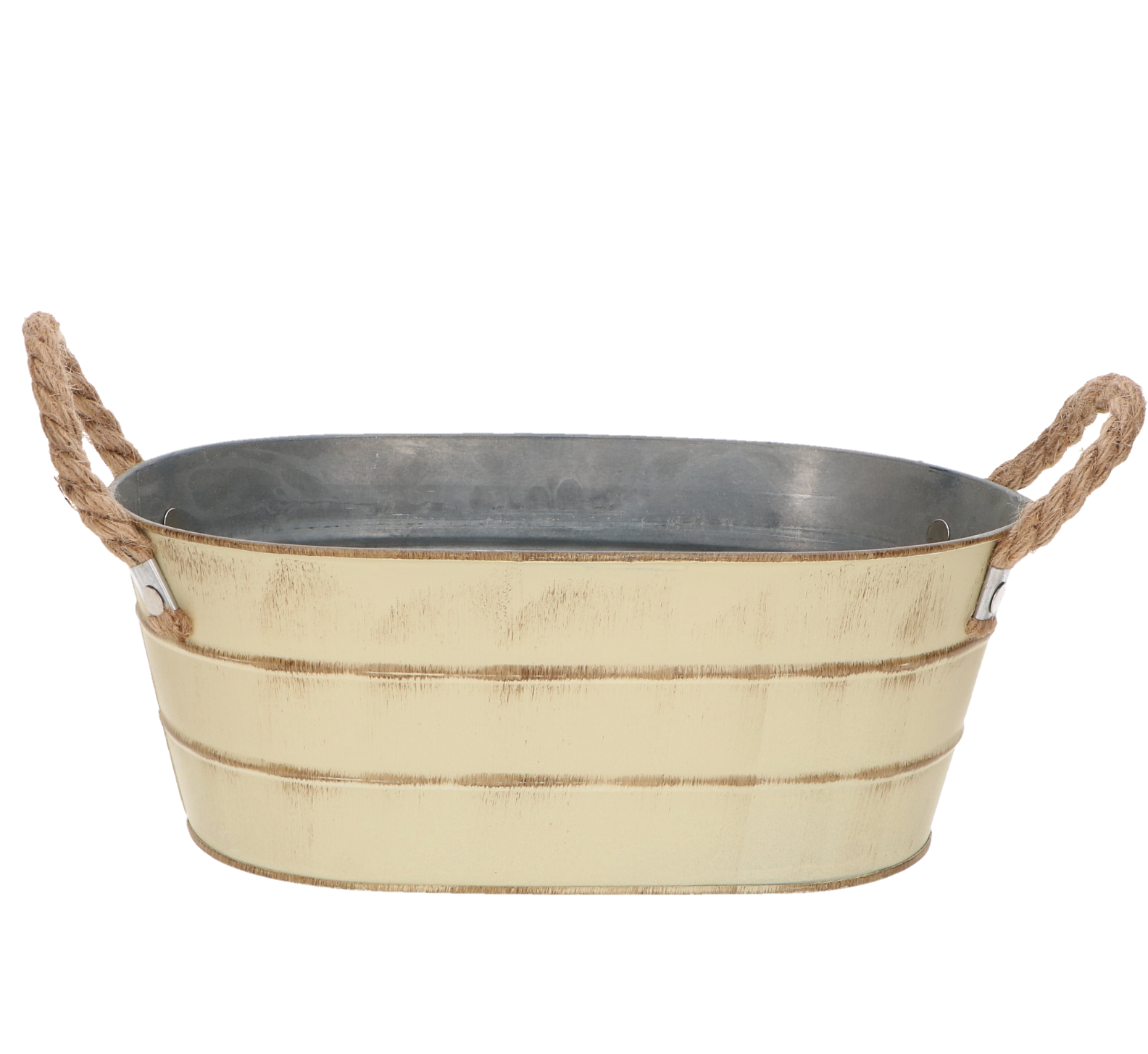 Osłonka podłużna metalowa z dwoma poziomymi pręgami i uchwytami ze sznura krem przecierana t:25*15 h:10 b:21*11 cm