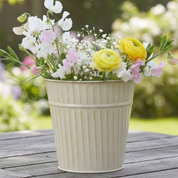 Metalowa ozdobna osłonka na kwiaty, zioła lub drobne przedmioty.