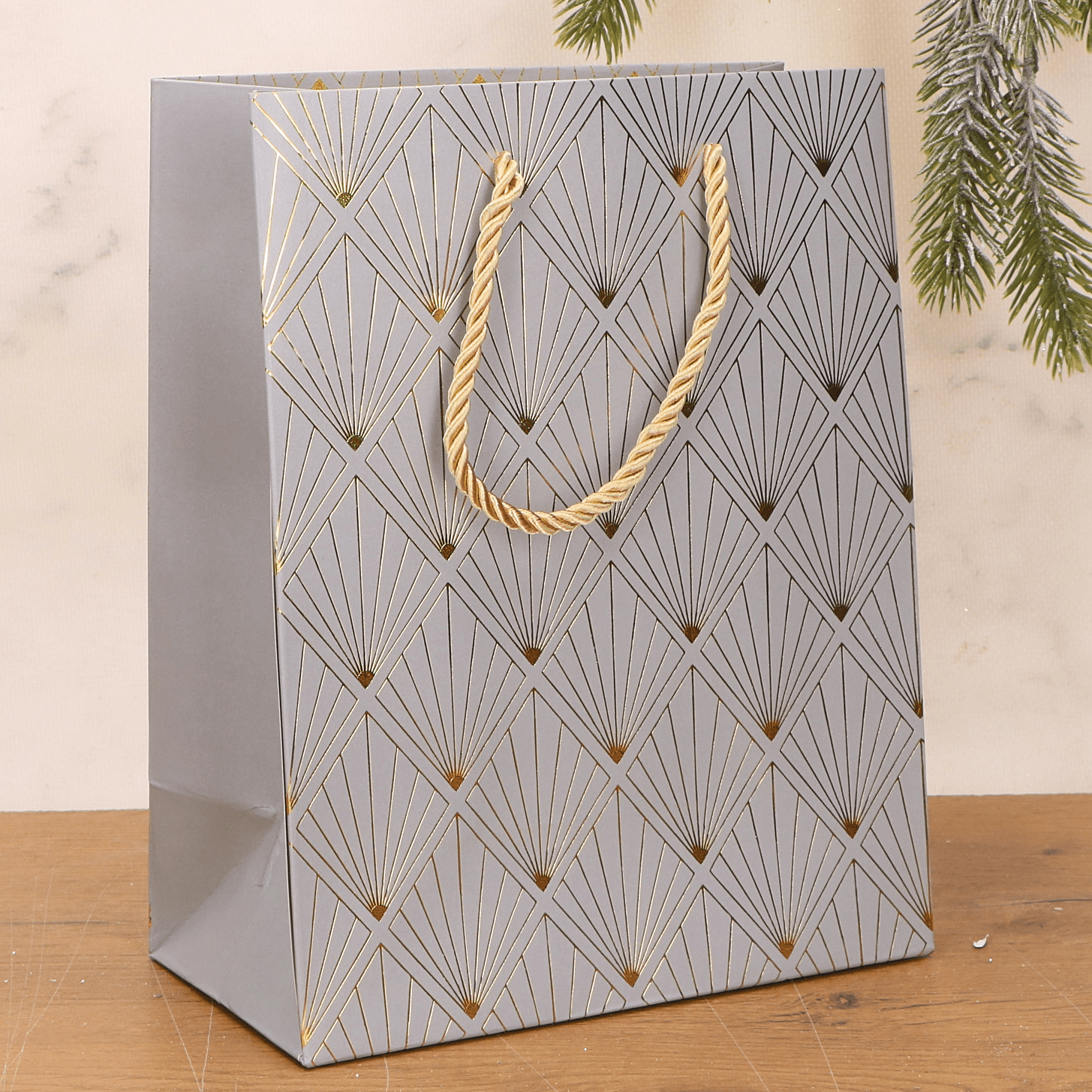 Te eleganckie papierowe torebki na prezent są uosobieniem nowoczesnego designu i wyrafinowanego smaku. Każda torebka prezentuje się z klasą dzięki geometrycznemu wzorowi z akcentami metalicznego złota, które nadają im ekskluzywnego charakteru. Oferowane w mixie czterech kolorów, są idealnym wyborem na każdą okazję, zapewniając, że Twój prezent będzie się wyróżniał i był zapamiętany.
