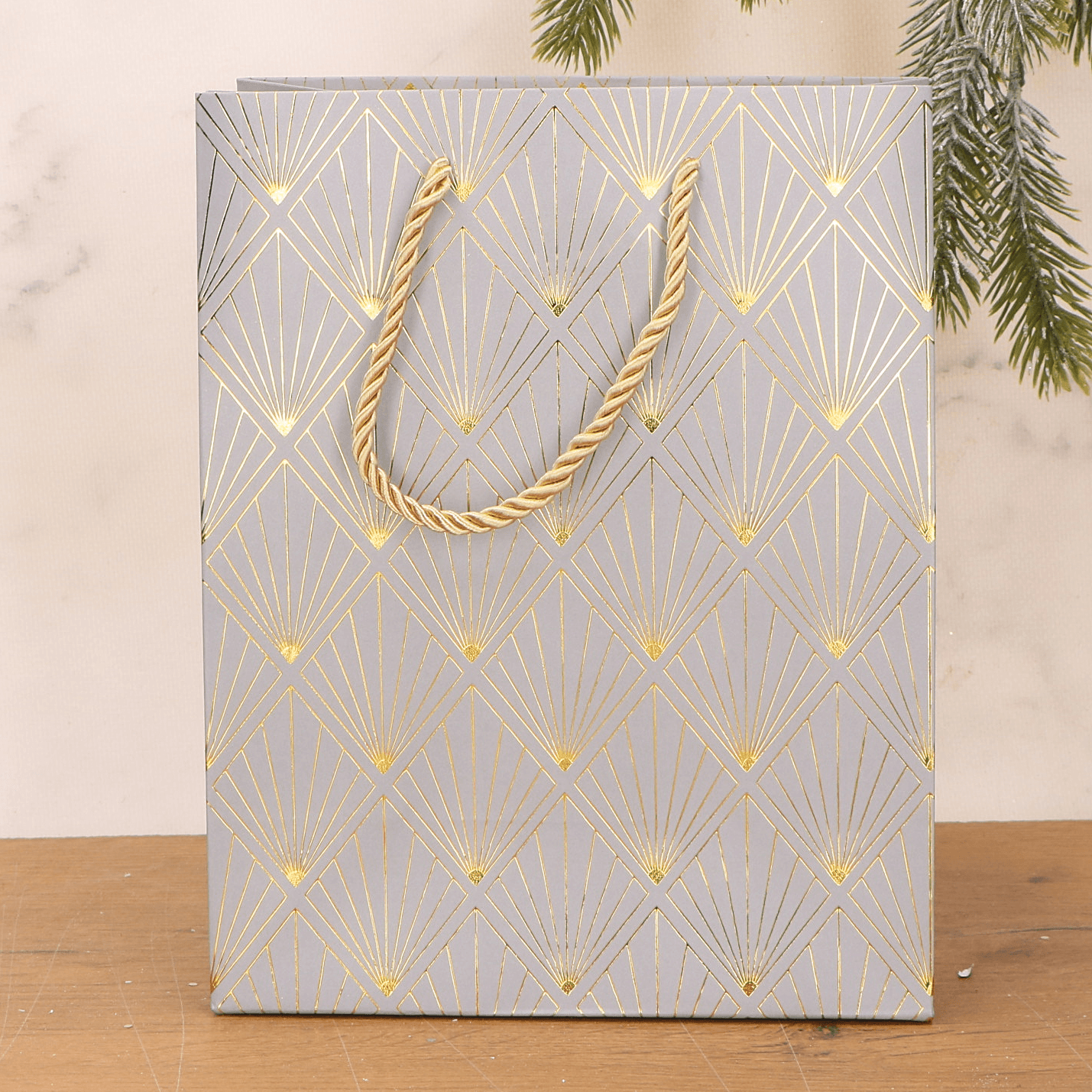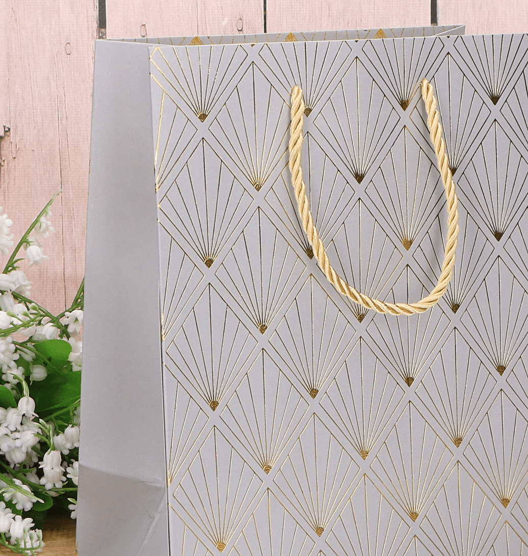 Te eleganckie papierowe torebki na prezent są uosobieniem nowoczesnego designu i wyrafinowanego smaku. Każda torebka prezentuje się z klasą dzięki geometrycznemu wzorowi z akcentami metalicznego złota, które nadają im ekskluzywnego charakteru. Oferowane w mixie czterech kolorów, są idealnym wyborem na każdą okazję, zapewniając, że Twój prezent będzie się wyróżniał i był zapamiętany.
