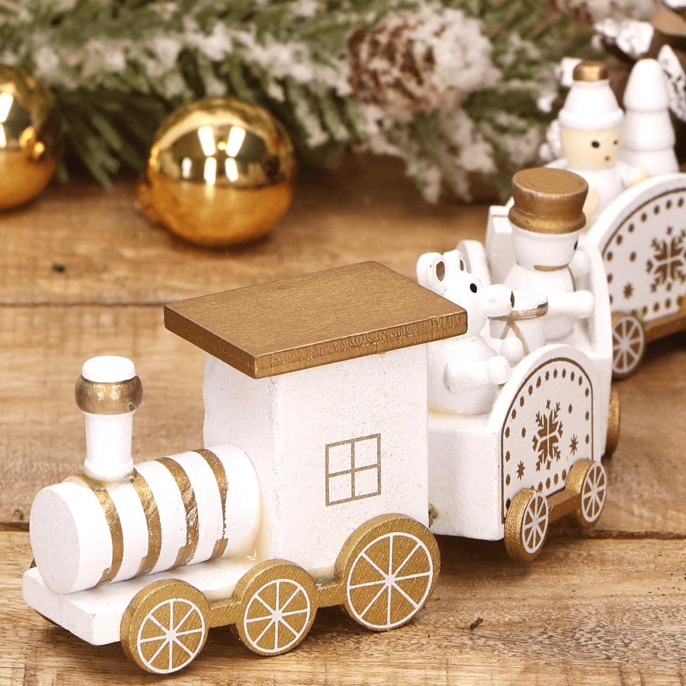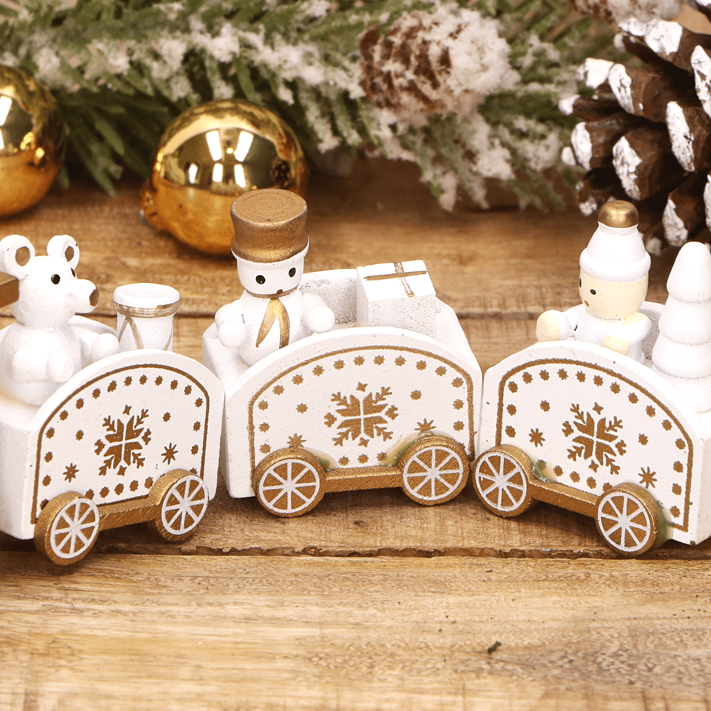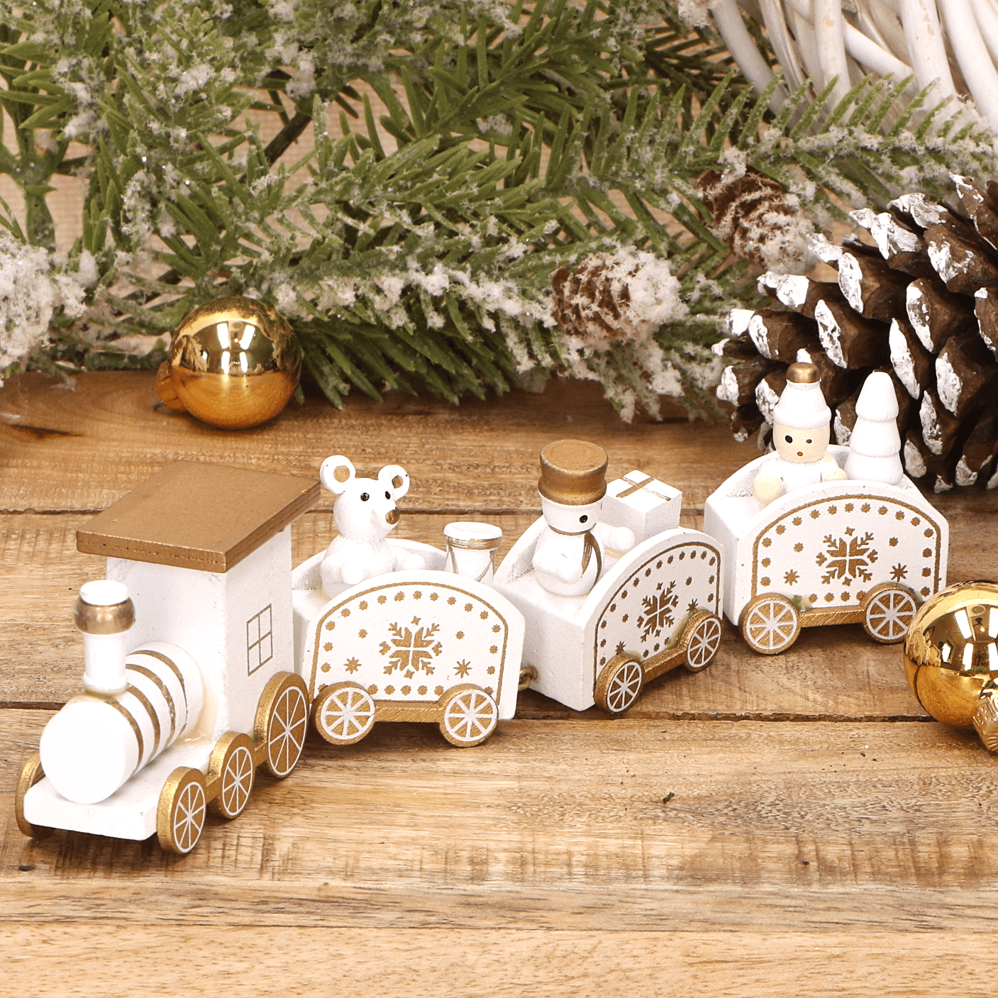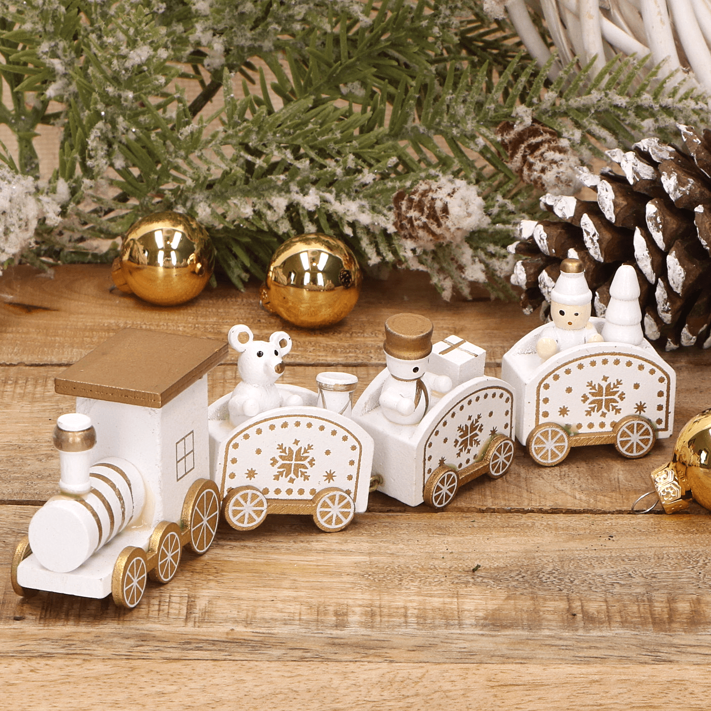 Ten uroczy dekoracyjny pociąg świąteczny to doskonały dodatek do twojego świątecznego wystroju. W kolorze śnieżnej bieli z złotymi detalami każdy wagonik jest przepięknie wykonany i pełen wdzięku. To element, który przyciąga wzrok i wprowadza domowników oraz gości w radosny, świąteczny nastrój. Postaw go pod choinką lub na kominku, aby dodać odrobinę ciepła i uroku tradycyjnym świątecznym dekoracjom. Pociąg jest wykonany z wielką starannością, co gwarantuje, że będzie częścią Twoich świąt przez wiele lat.