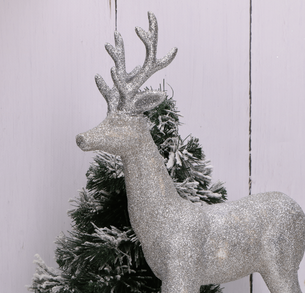 Renifer brokatowy srebrny 32 cm