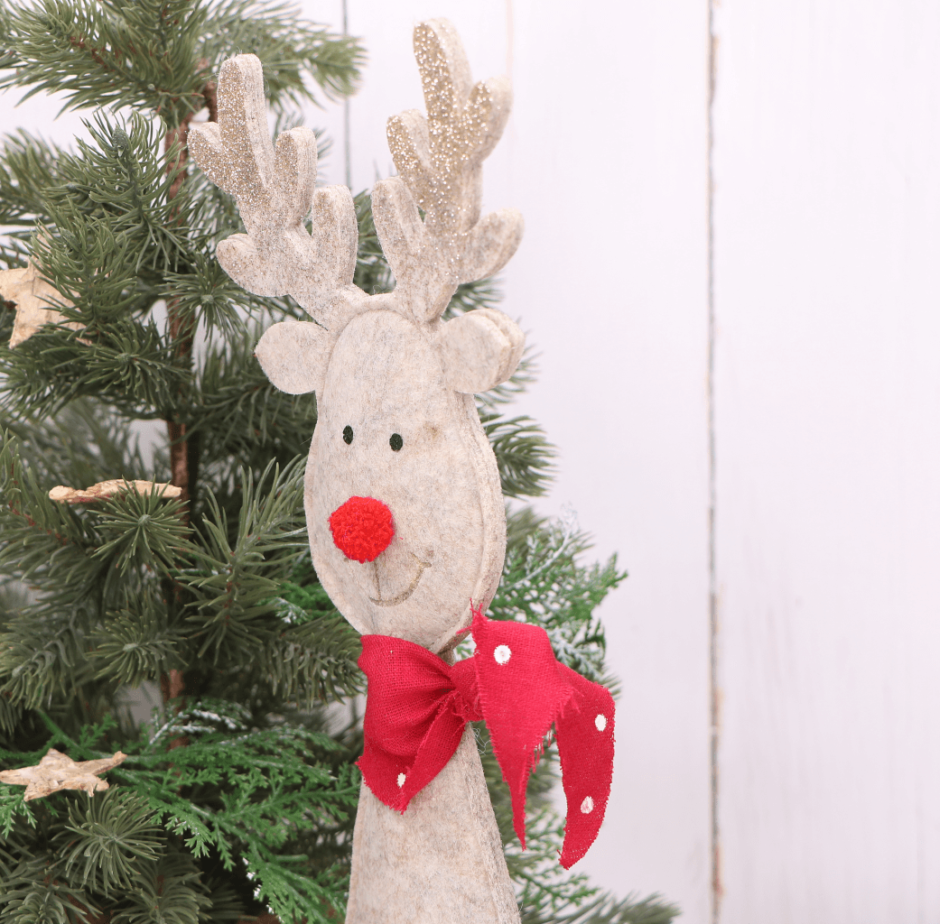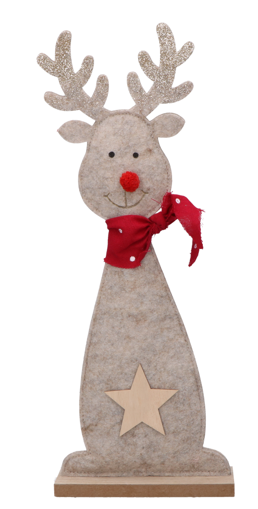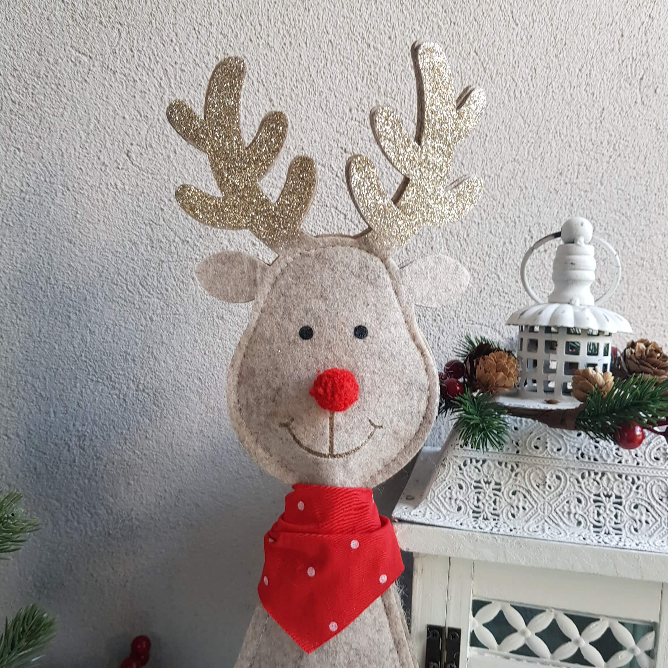 Wspaniałym pomysłem na urozmaicenie wystroju naszego domu jest renifer w kolorze beżowym, którego rogi zostały wykonane z delikatnego filcu pokrytego złotym brokatem, aby jeszcze bardziej przywoływał świąteczny klimat w naszych domach. Każdy renifer nosi czerwoną apaszkę w kropki. Renifer ma piękny czerwony nosek, jak Rudolf - bohater znanej w krajach Zachodu opowieści świątecznej.