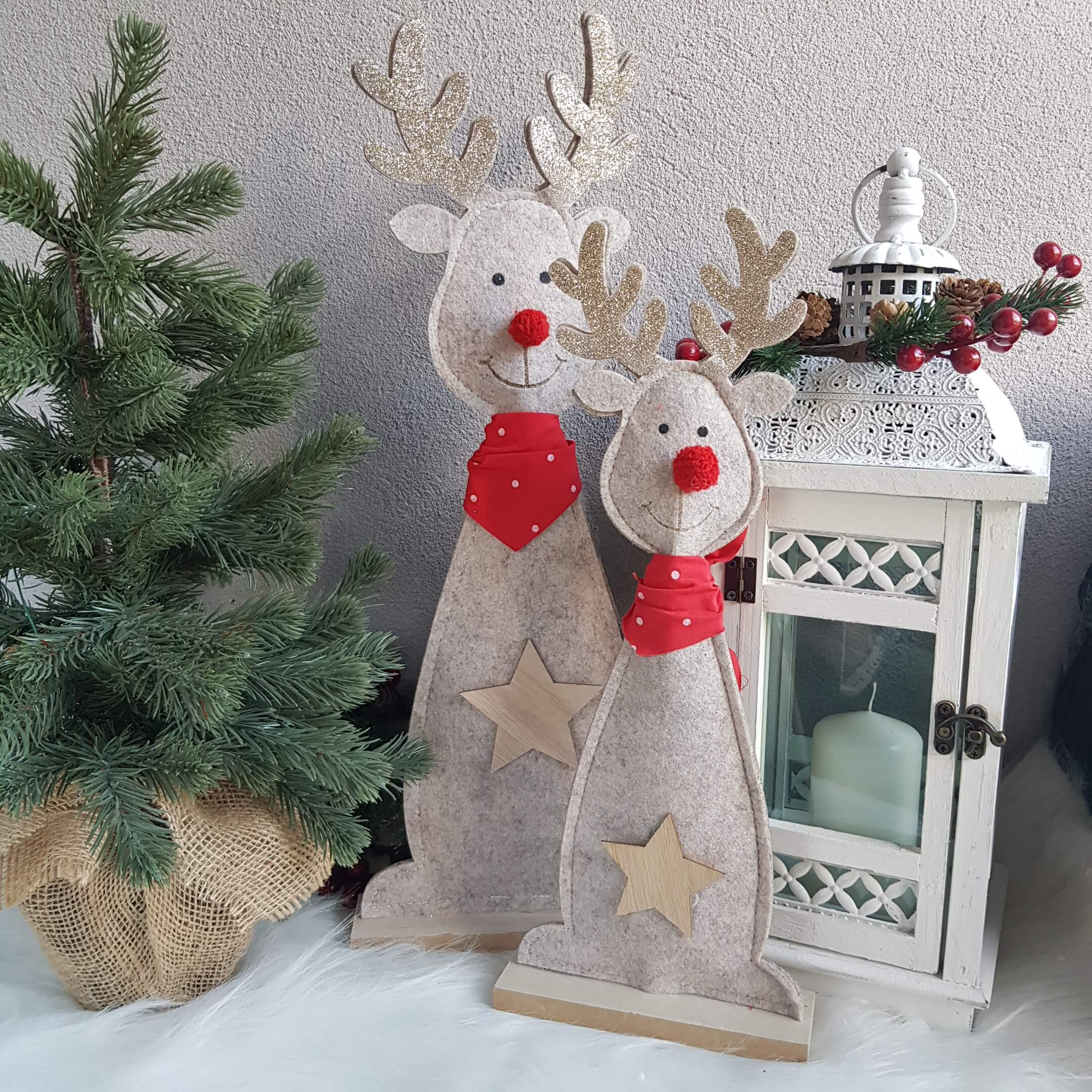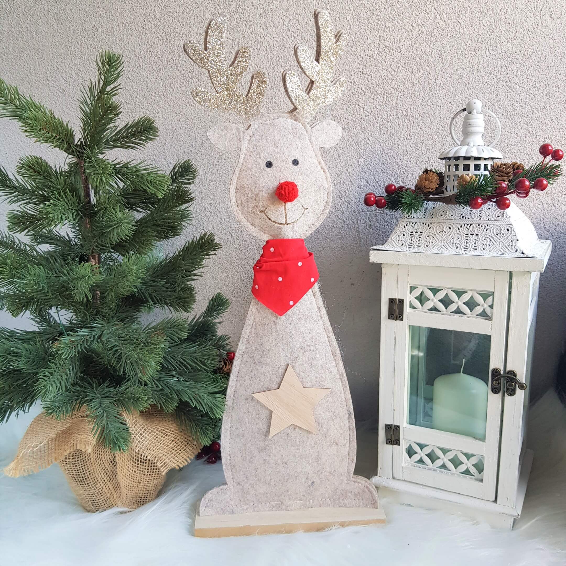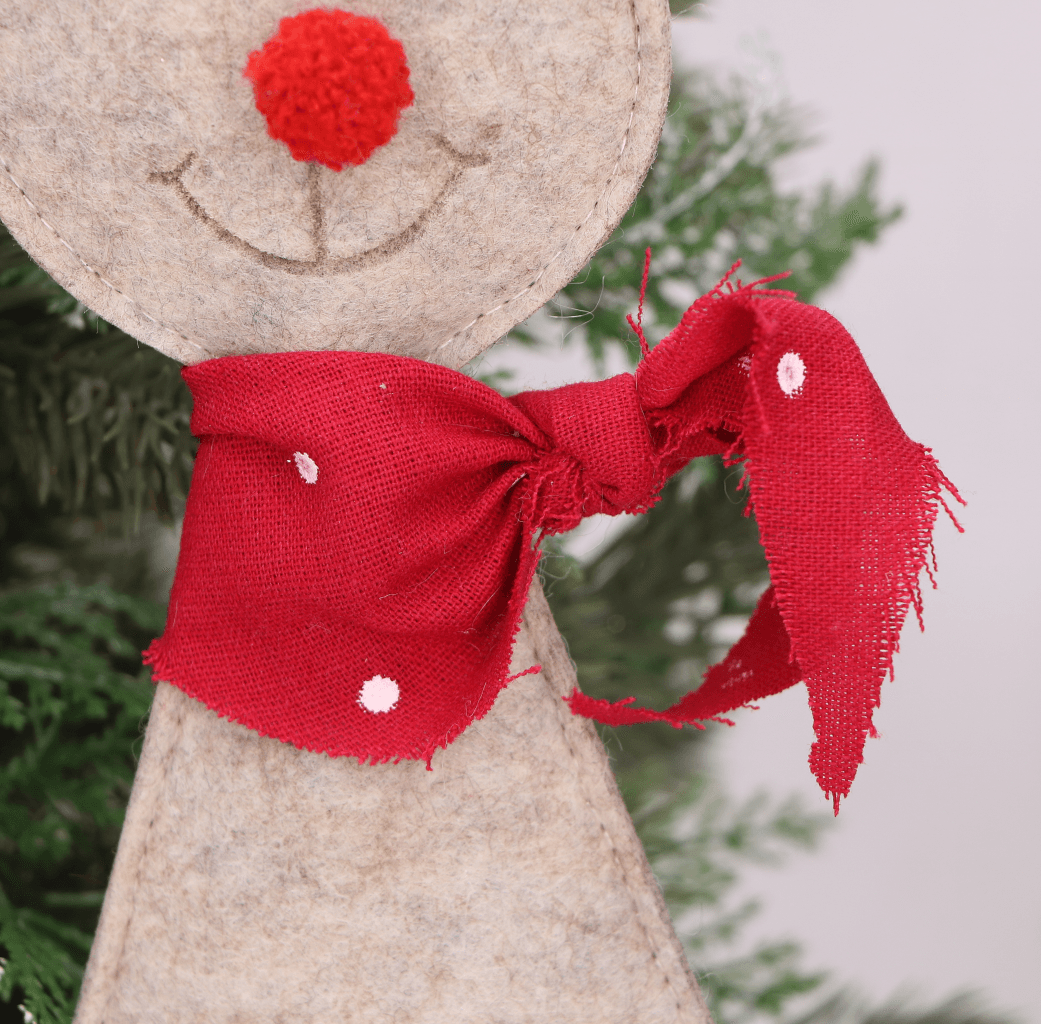 Wspaniałym pomysłem na urozmaicenie wystroju naszego domu jest renifer w kolorze beżowym, którego rogi zostały wykonane z delikatnego filcu pokrytego złotym brokatem, aby jeszcze bardziej przywoływał świąteczny klimat w naszych domach. Każdy renifer nosi czerwoną apaszkę w kropki. Renifer ma piękny czerwony nosek, jak Rudolf - bohater znanej w krajach Zachodu opowieści świątecznej.