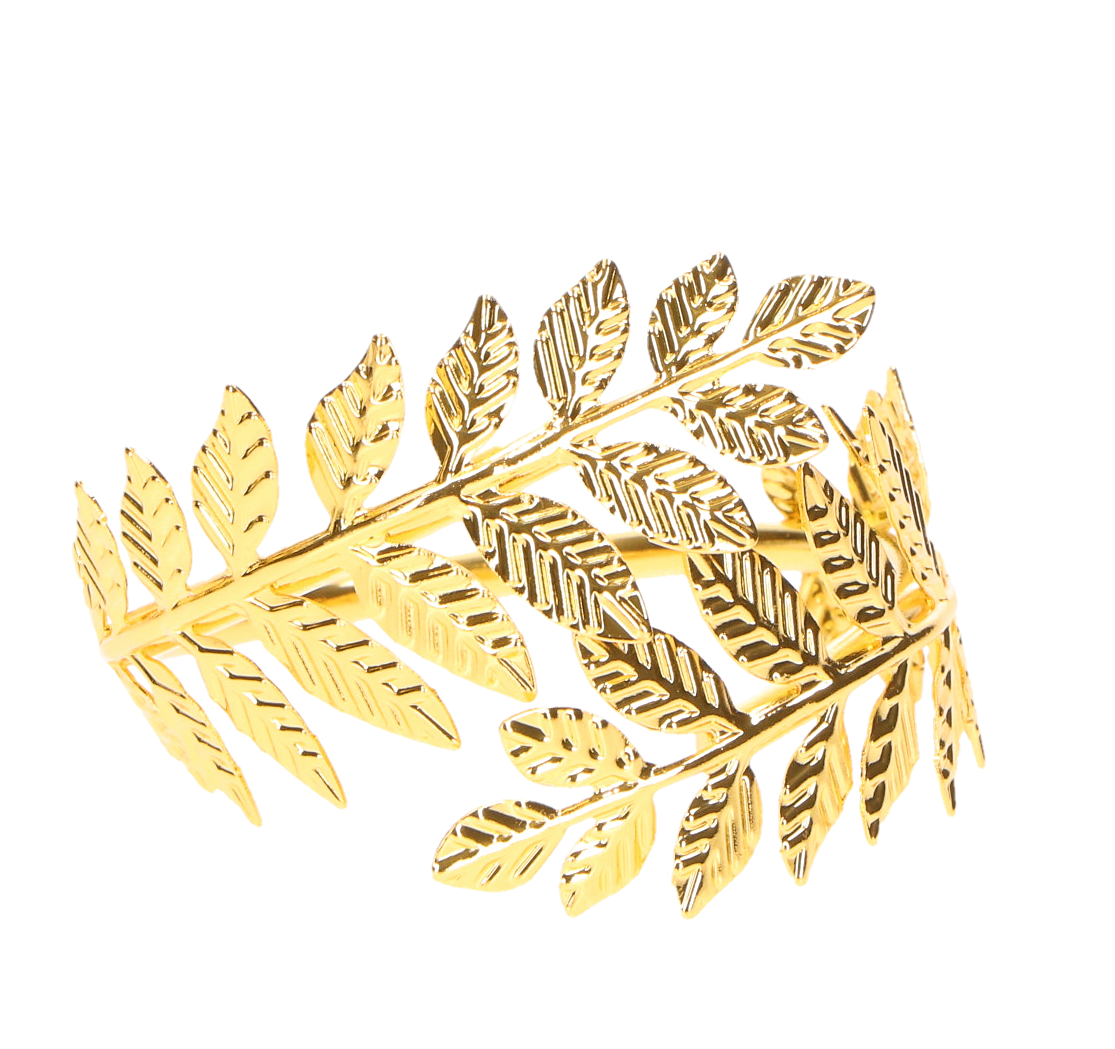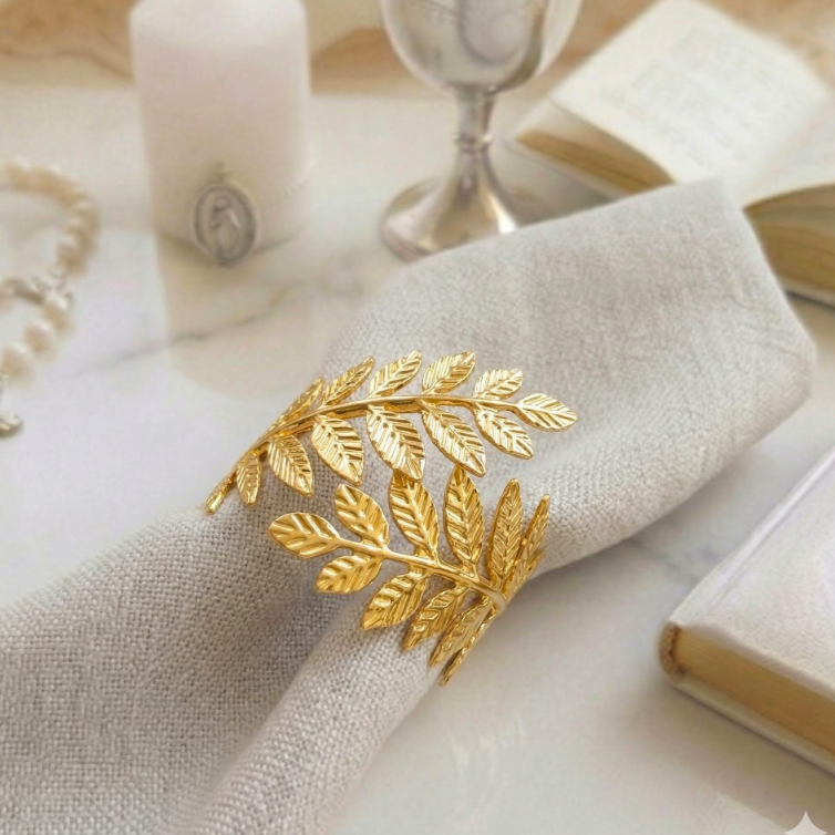 Złoty serwetnik z motywem liści – elegancka dekoracja stołu