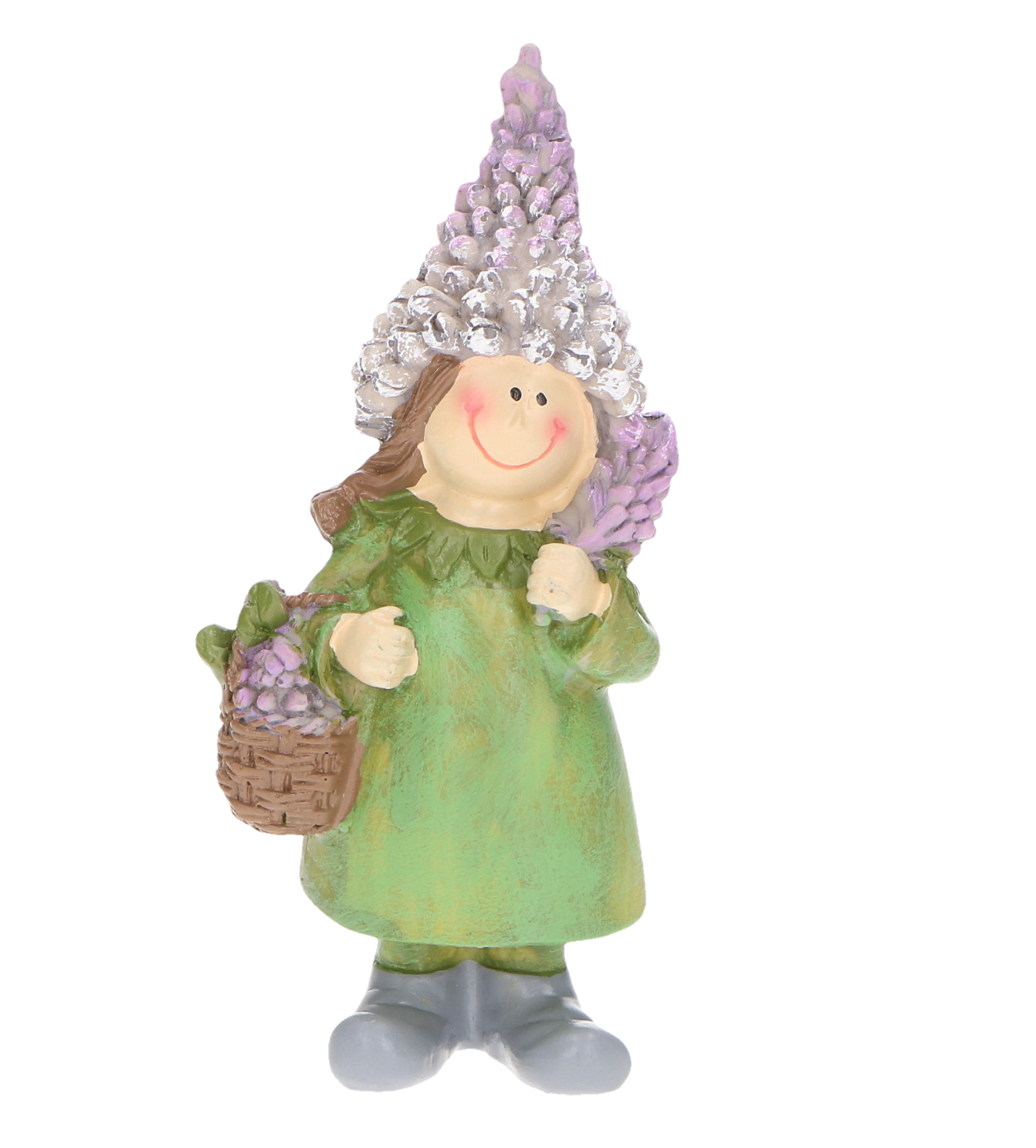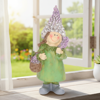 Urocza ceramiczna figurka skrzat dziewczynka to wyjątkowa dekoracja, która wprowadzi do wnętrza radosny, wiosenny klimat. Postać w zielonej sukience z koszyczkiem oraz bukietem fioletowych kwiatów zachwyca starannym wykonaniem i subtelną pastelową kolorystyką. Charakterystyczna czapka w kształcie hiacyntu podkreśla sezonowy charakter ozdoby i sprawia, że figurka doskonale wpisuje się w aranżacje wielkanocne oraz wiosenne. To idealna dekoracja do domu na wiosnę, która pięknie zaprezentuje się na komodzie, parapecie, półce czy jako element stroika. Kompaktowy rozmiar sprawia, że skrzat świetnie komponuje się z innymi ozdobami, tworząc spójną, klimatyczną aranżację.