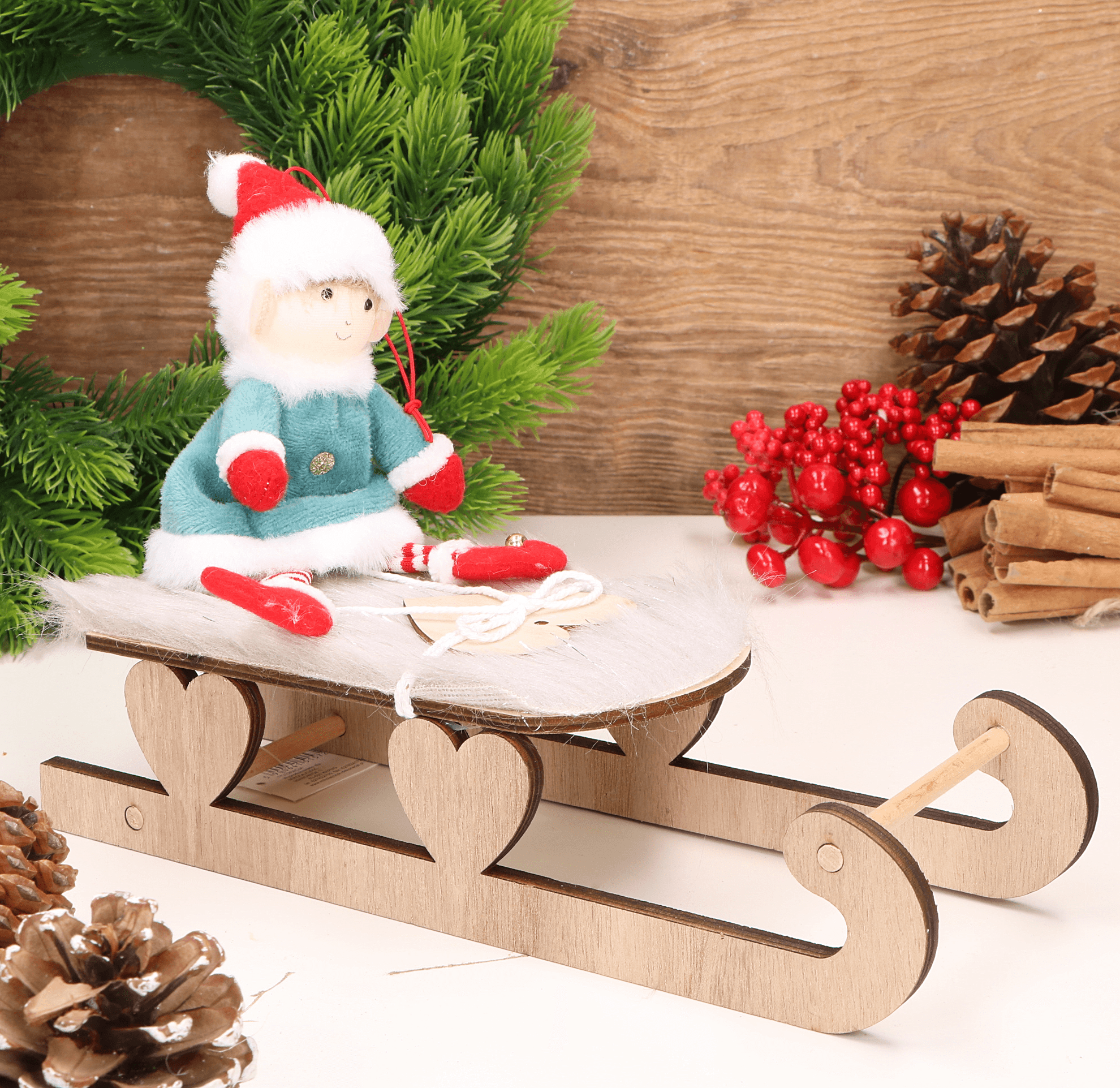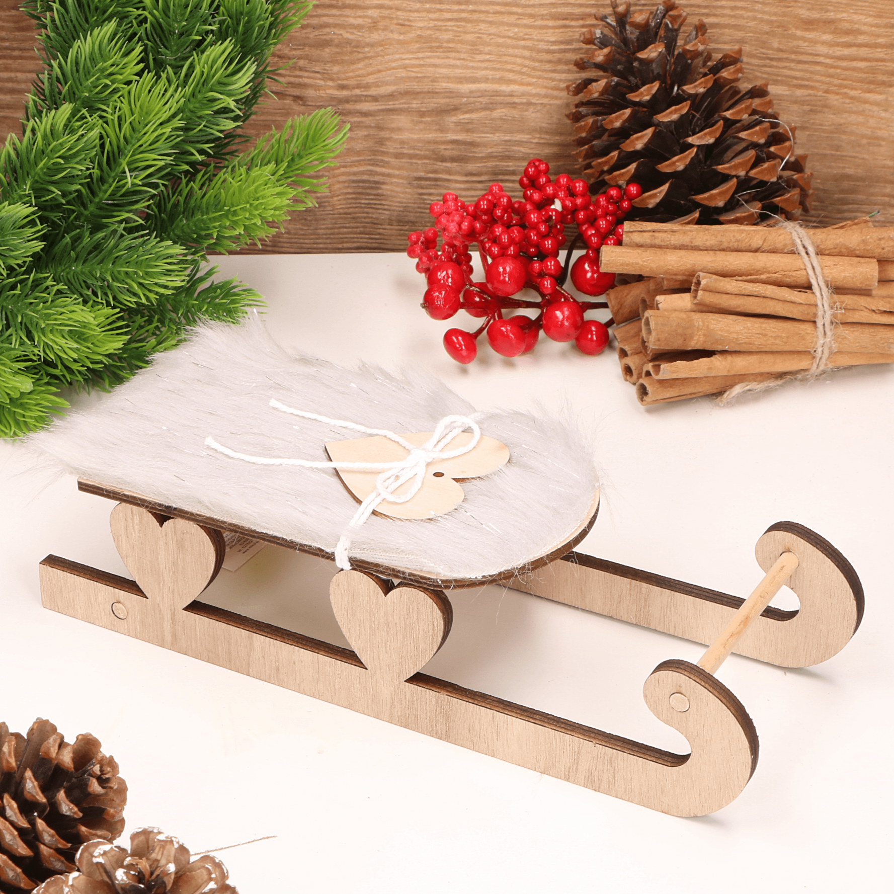 Sanki drewniane z futerkiem i serduszkiem 25x9x6cm