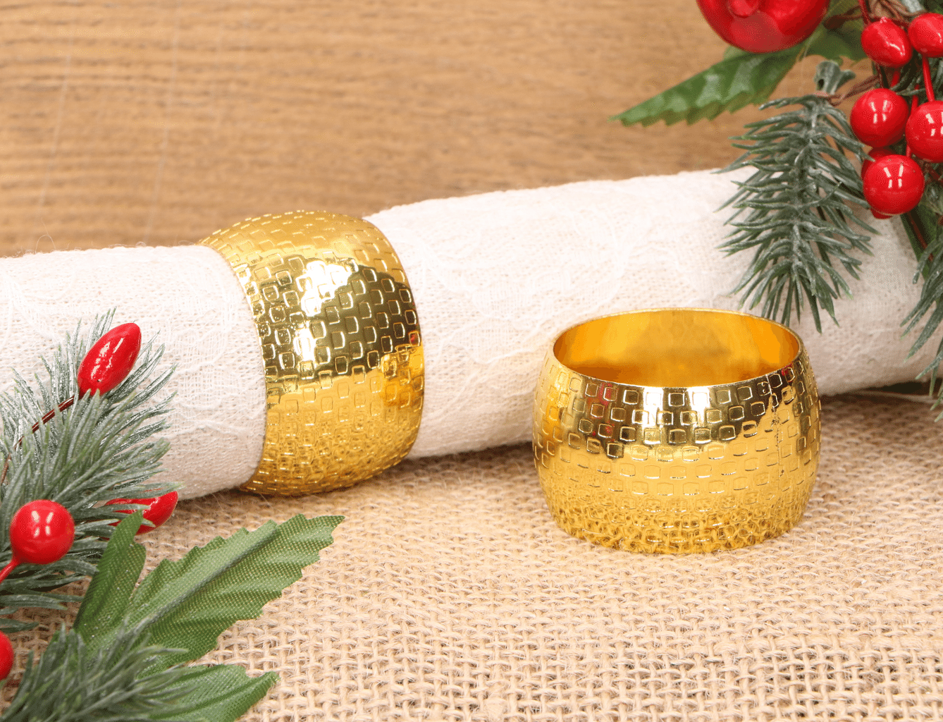 Dodaj odrobinę luksusu i elegancji do swojego stołu dzięki złotemu serwetnikowi o stylowym, połyskującym wykończeniu. Jego ponadczasowy design sprawia, że doskonale komponuje się zarówno z klasycznymi, jak i nowoczesnymi aranżacjami. Serwetnik wykonany jest z wysokiej jakości materiału, który zapewnia trwałość i odporność na uszkodzenia. Delikatny, tłoczony wzór dodaje mu wyjątkowego charakteru, przyciągając wzrok i podkreślając prestiżowy wygląd stołu. Idealny na święta, uroczystości oraz eleganckie przyjęcia, nadaje dekoracji stołu niezwykłego blasku i szyku. Sprawdzi się zarówno w domowym zaciszu, jak i w restauracjach czy hotelach.