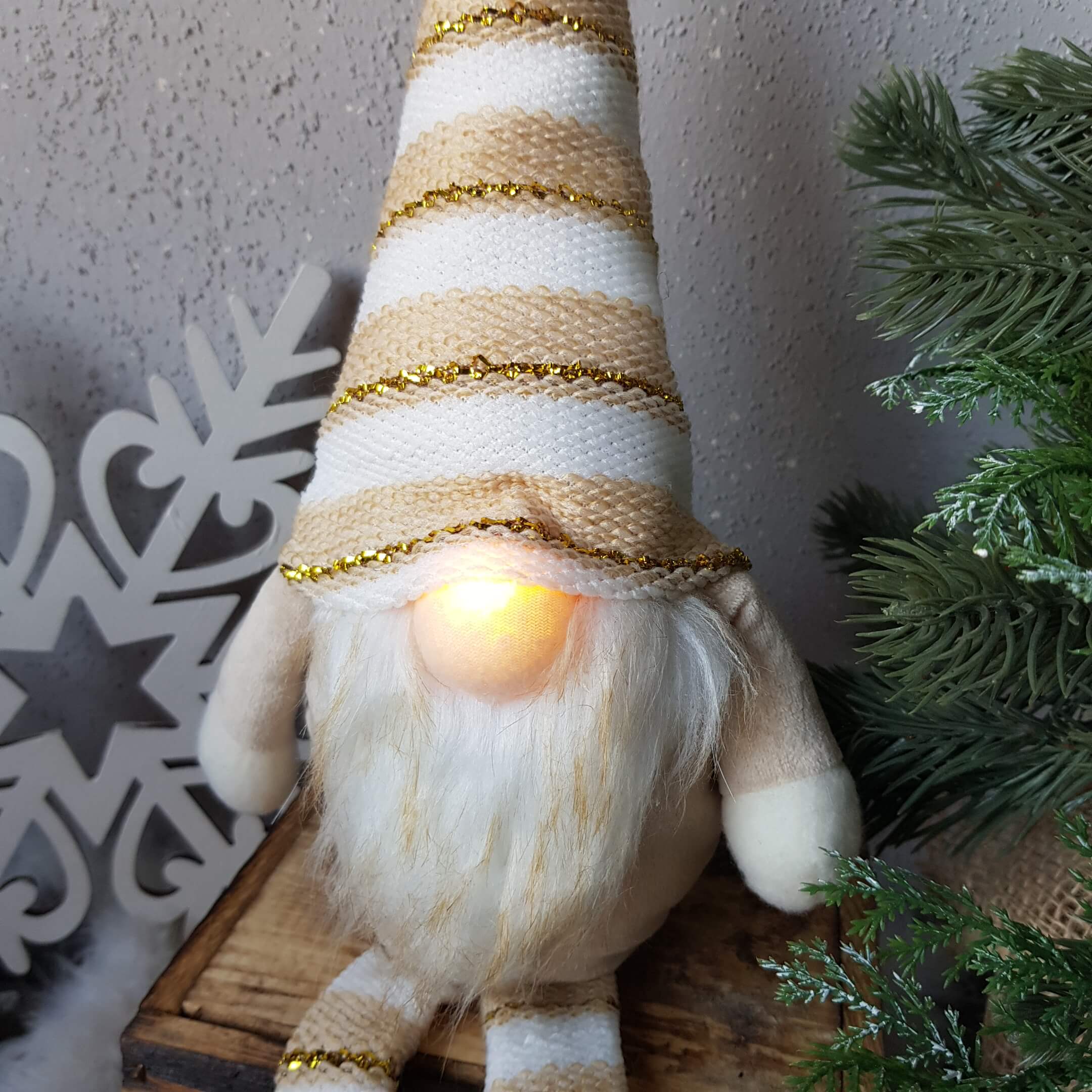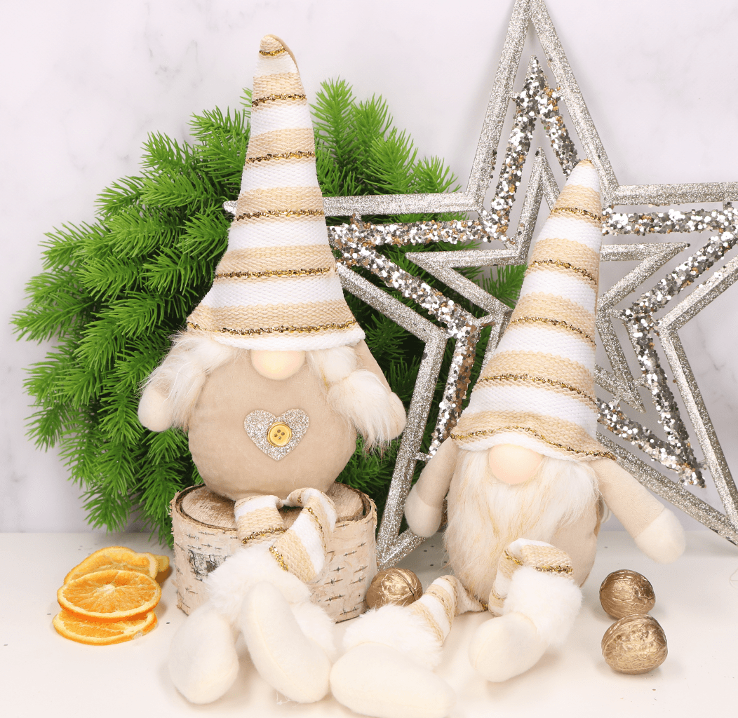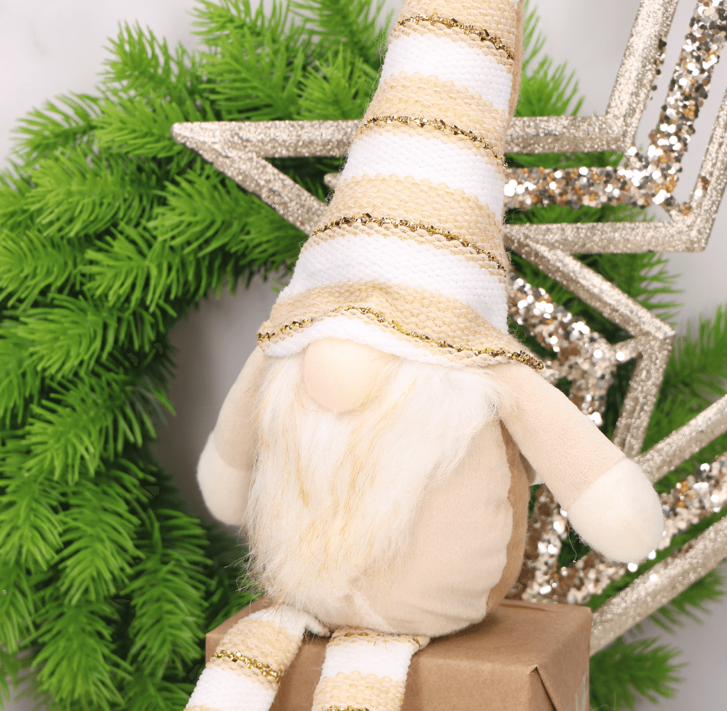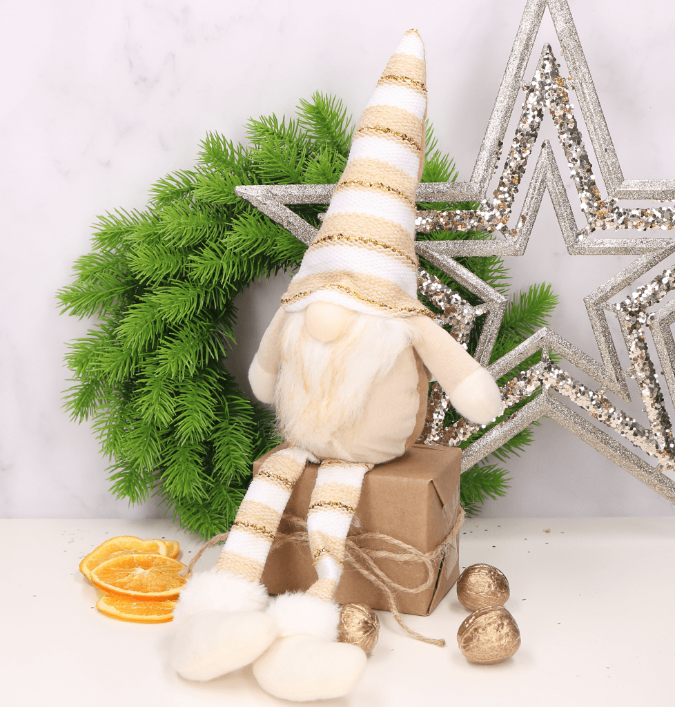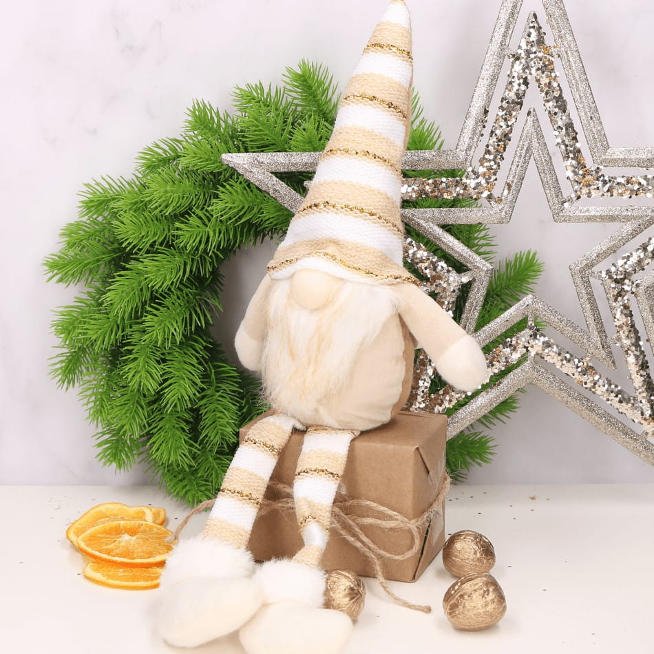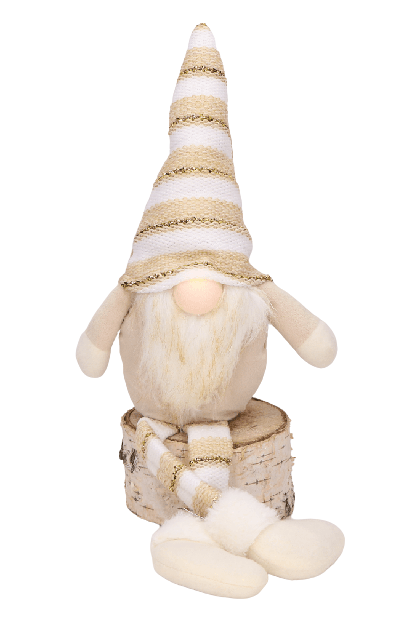 Wraz z przyjściem grudniowych, mroźnych wieczorów wszyscy z niecierpliwością zaczynamy odliczać dni, do najbardziej wyjątkowych świąt w roku, którymi są Święta Bożego Narodzenia. Są to święta pełne ciepła i miłości. Nierozłącznym elementem tych pięknych świąt są dekoracje świąteczne, które stwarzają w naszych domach magiczną atmosferę bożonarodzeniową. Ciekawym pomysłem na tegoroczny wystrój świąteczny, jest siedzący skrzacik ubrany w uroczy, jasnobrązowy materiałowy kubraczek oraz czapeczkę w paski, który dzięki swojej subtelności idealnie skomponuje się z innymi świątecznymi dekoracjami. Skrzat wyposażony jest w świecący nosek.