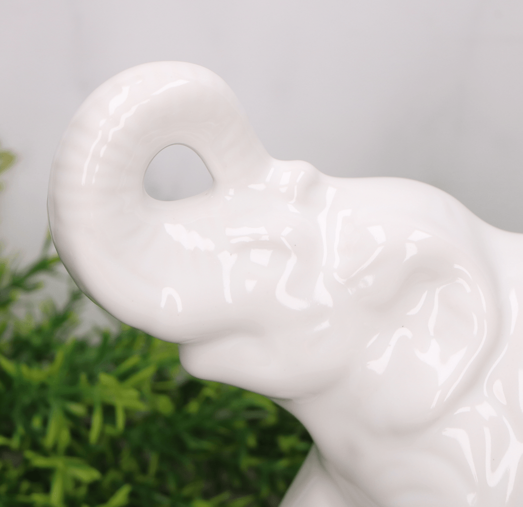 Słoń "siedzący okrakiem" szkliwiony biały 14cm