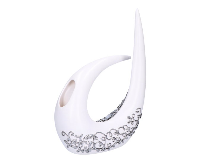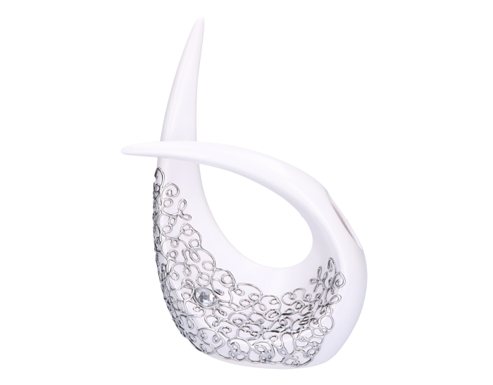 Ceramika jest wypalana dzięki czemu w swojej konsystencji pozostaje mocnym materiałem, trwałym i dość odpornym na stłumecznia w porównaniu do kreacji wyrzeźbionych z gipsu. Wykończenie produktu jest natomiast pokryte srebrnym zdobionym klejem.