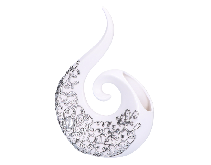 Ceramika jest wypalana dzięki czemu w swojej konsystencji pozostaje mocnym materiałem, trwałym i dość odpornym na stłumecznia w porównaniu do kreacji wyrzeźbionych z gipsu. Wykończenie produktu jest natomiast pokryte srebrnym zdobionym klejem.