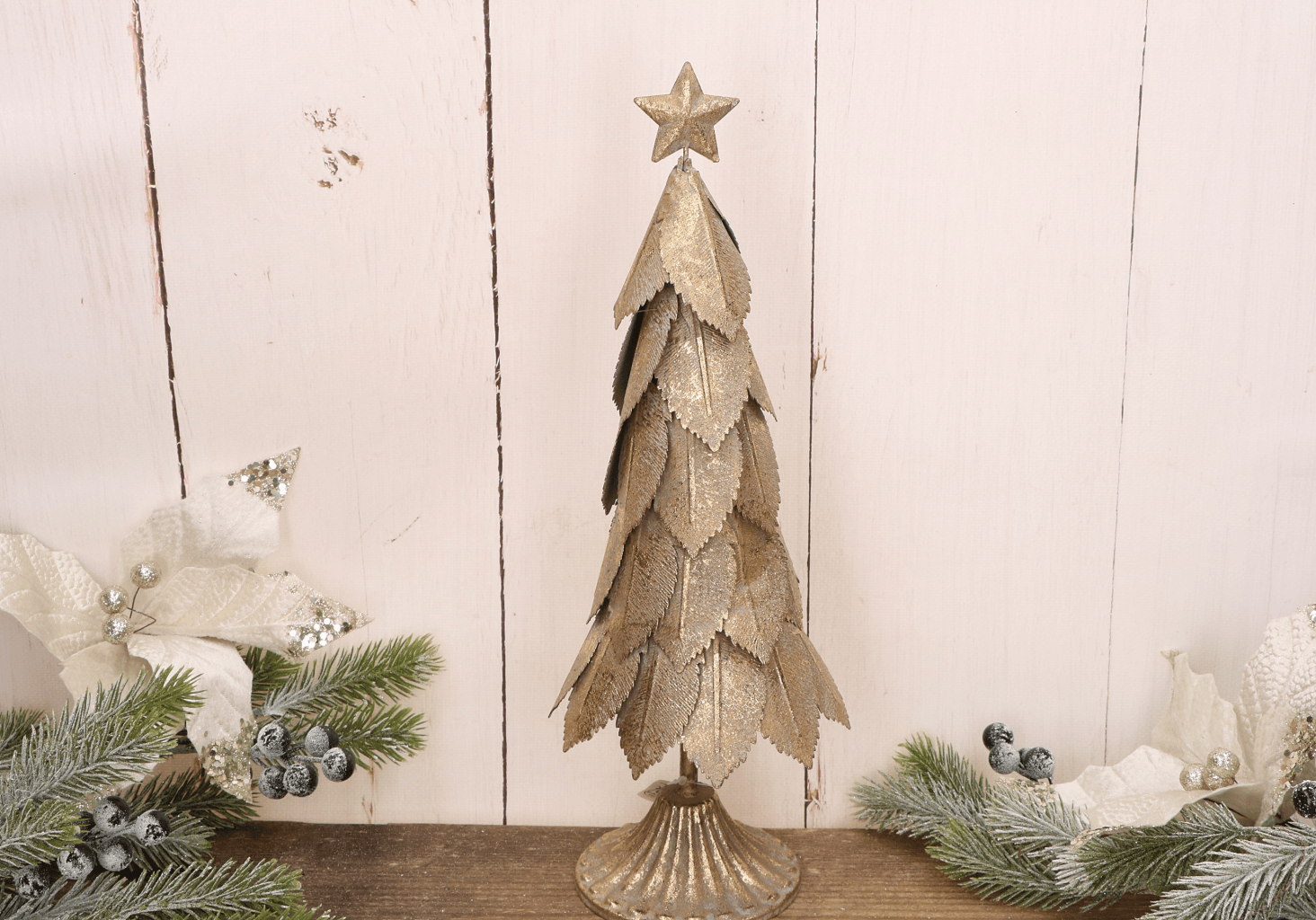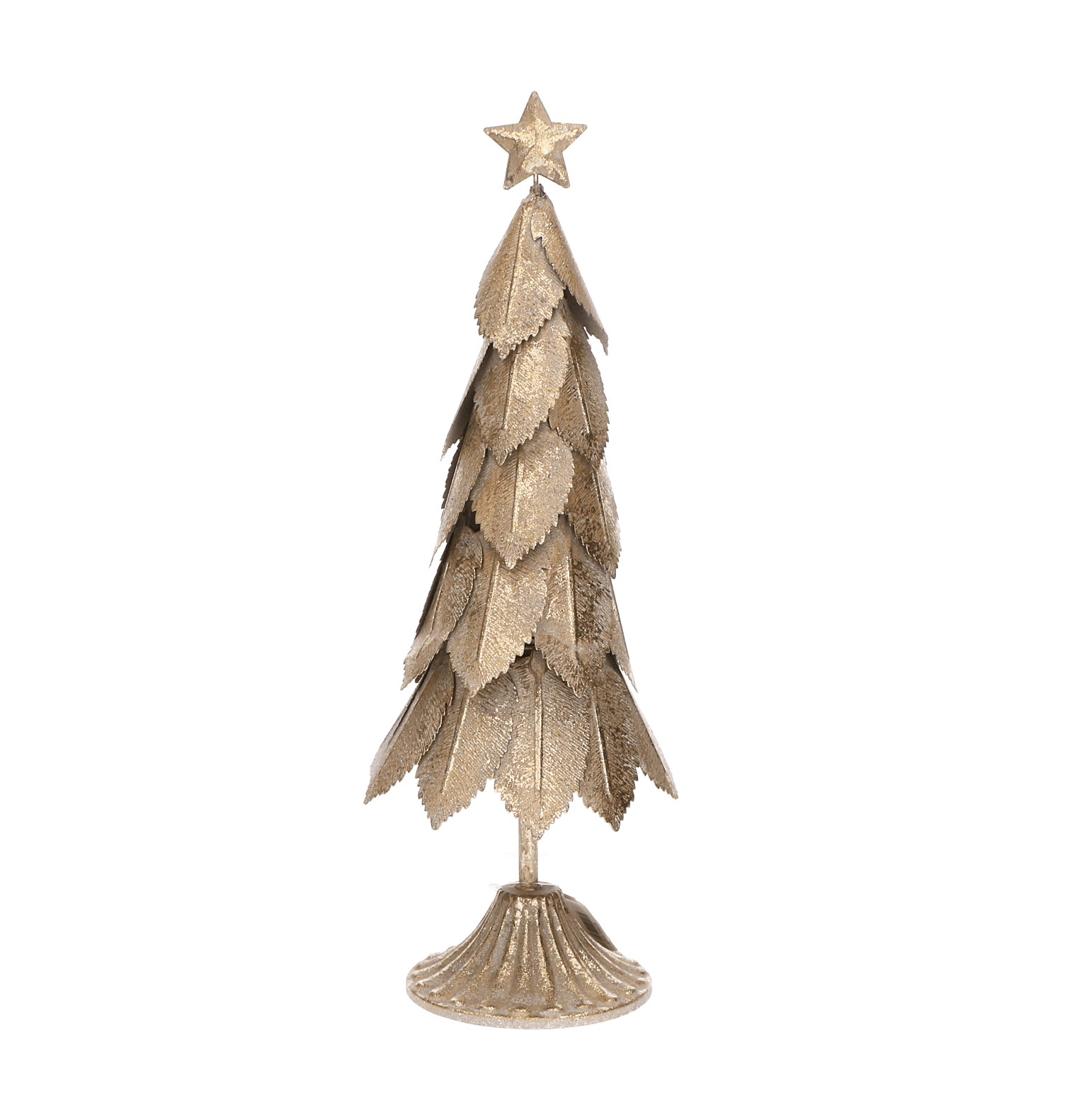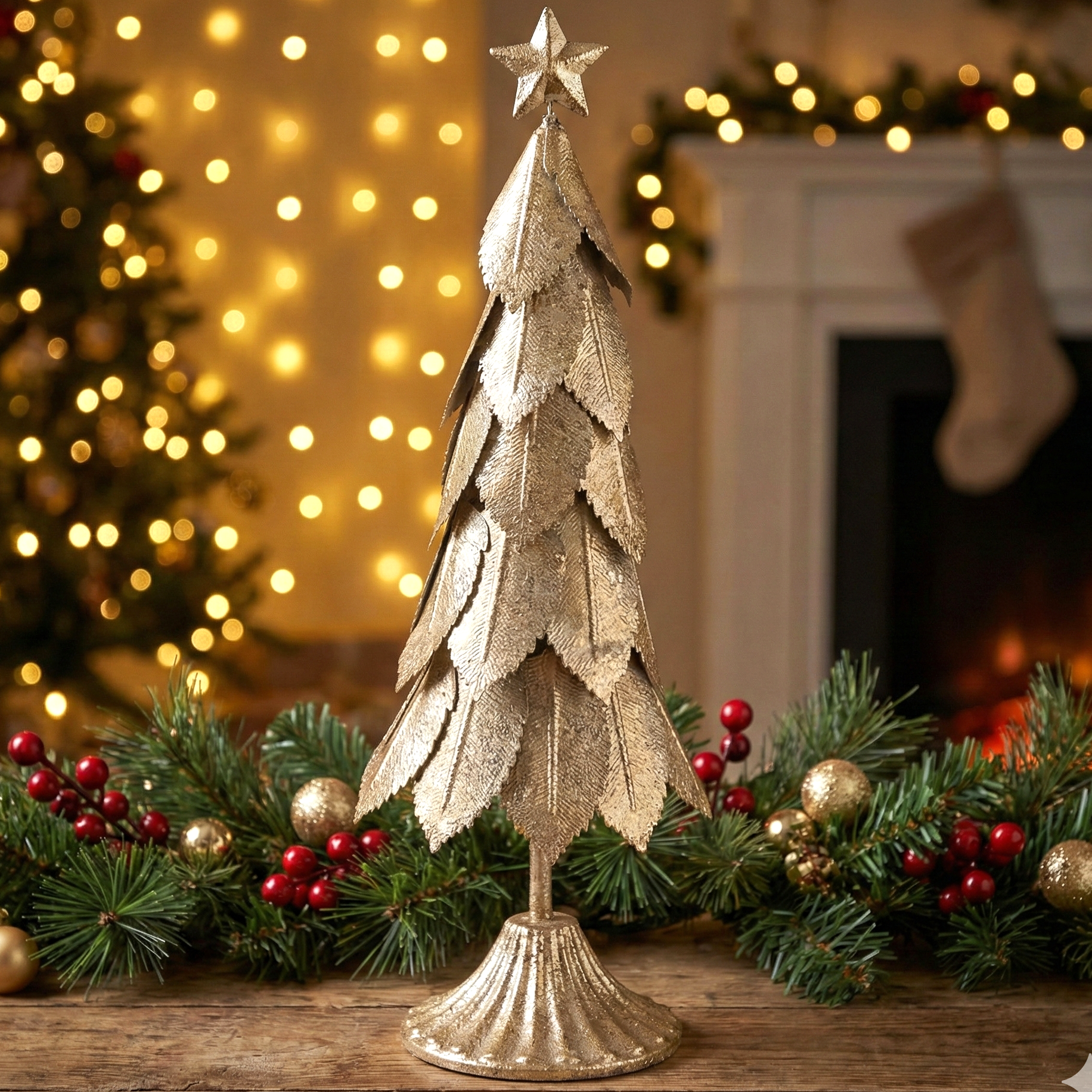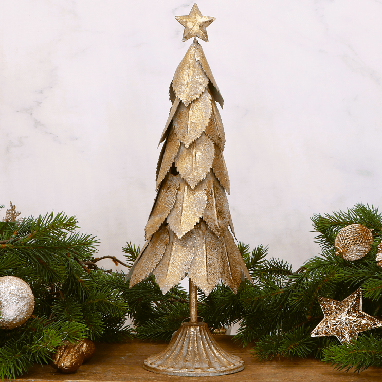 Elegancka świąteczna choinka wykonana z metalu w kolorze złotym to wyjątkowa ozdoba, która doda blasku i uroku każdemu wnętrzu. Jej warstwowy design przypominający liście, połączony z postarzaną złotą powierzchnią, nadaje dekoracji wyjątkowego charakteru. Na szczycie znajduje się ozdobna gwiazda, która dodatkowo podkreśla świąteczny klimat. Choinka świetnie sprawdzi się jako dekoracja na stół, kominek lub parapet, wprowadzając ciepłą i przytulną atmosferę. Dzięki solidnej metalowej konstrukcji jest trwała i stabilna.