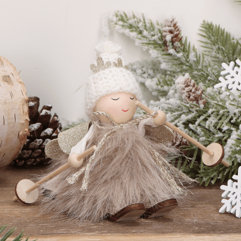 Świąteczny aniołek na nartach w beżowej sukience