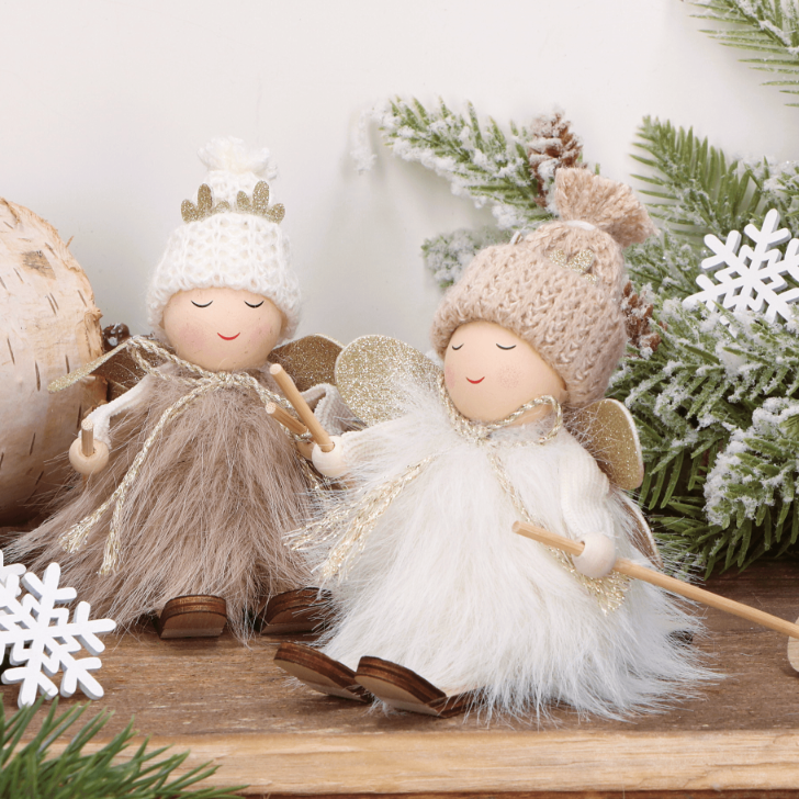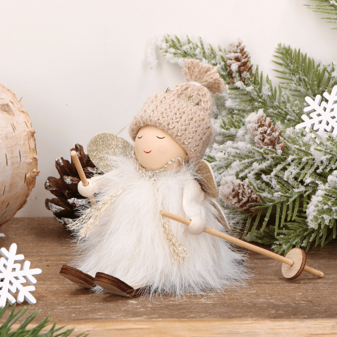 Świąteczny aniołek na nartach w białej sukience