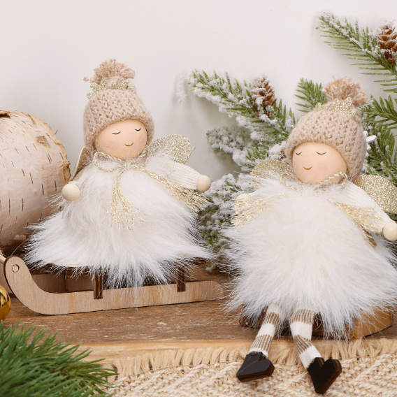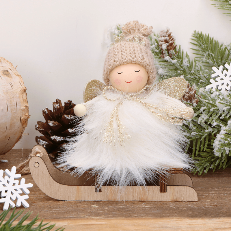 Świąteczny aniołek z kremowymi skrzydłami na sankach
