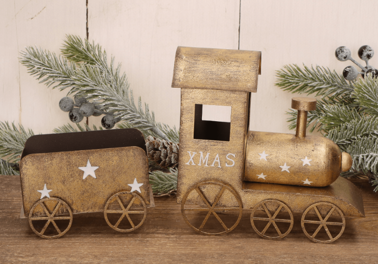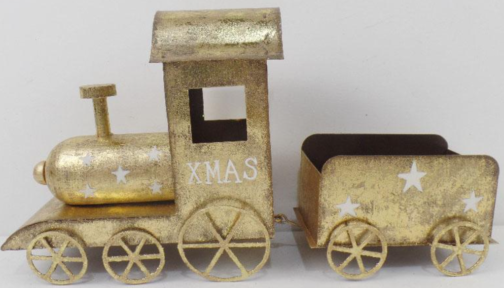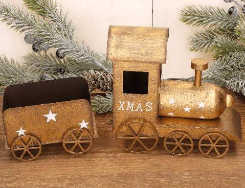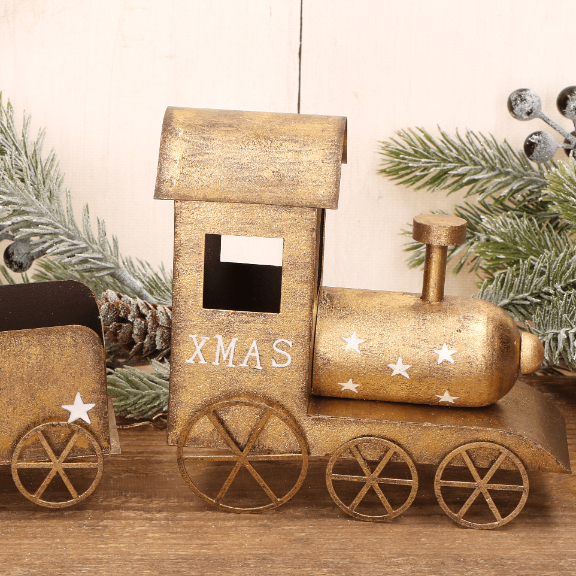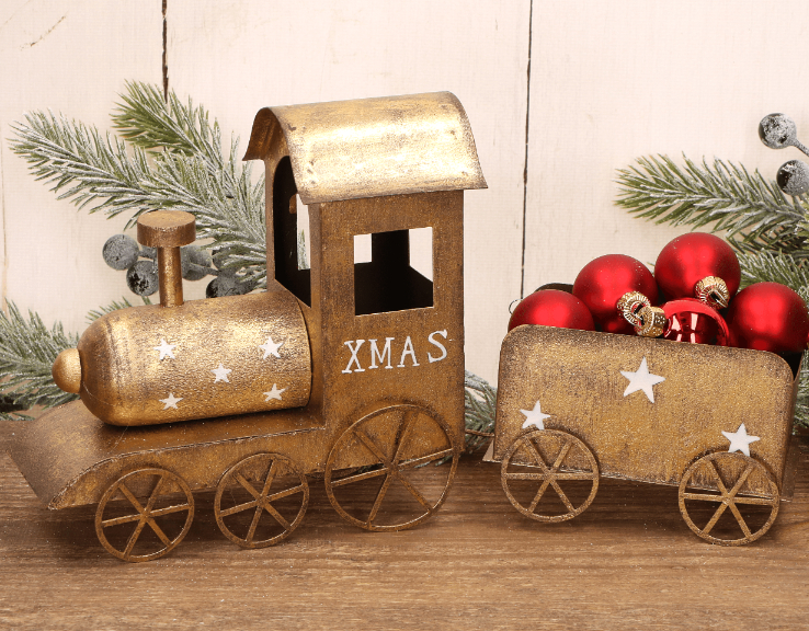 Świąteczny metalowy pociąg dekoracyjny XMAS – złoty, 26,5 cm