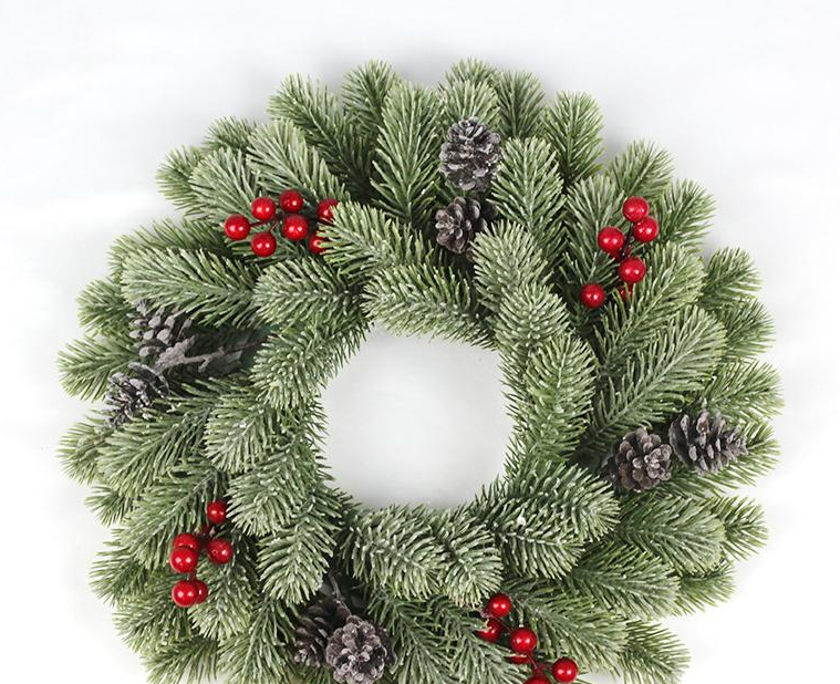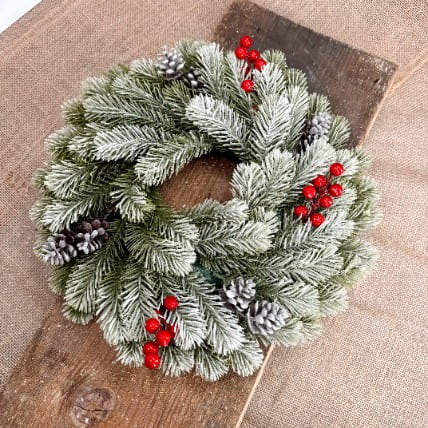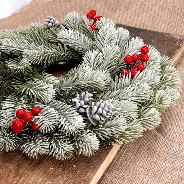 Świąteczny wianek dekoracyjny z oszronionymi gałązkami, szyszkami i jagodami 40 x 40 cm