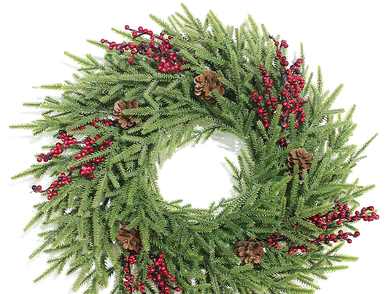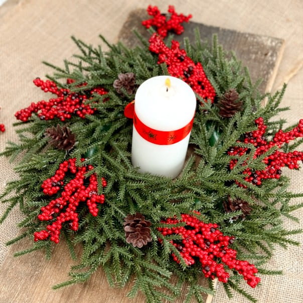 Świąteczny wianek dekoracyjny o średnicy 40 cm to klasyczna ozdoba, która wprowadzi do Twojego domu wyjątkowy, bożonarodzeniowy klimat. Wykonany z realistycznych zielonych gałązek, zdobiony naturalnymi szyszkami i intensywnie czerwonymi jagodami, prezentuje się niezwykle elegancko i świątecznie. Idealny do zawieszenia na drzwiach, ścianie lub jako dekoracja stołu. Dzięki swojej uniwersalnej formie, wianek pasuje do różnych stylów dekoracyjnych, od tradycyjnych po nowoczesne aranżacje. Trwała konstrukcja zapewnia jego użyteczność przez wiele sezonów, a żywe kolory sprawiają, że będzie głównym akcentem świątecznej dekoracji.