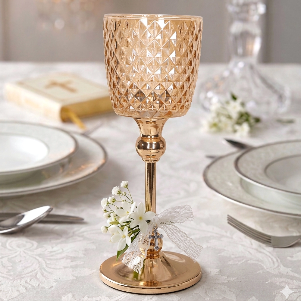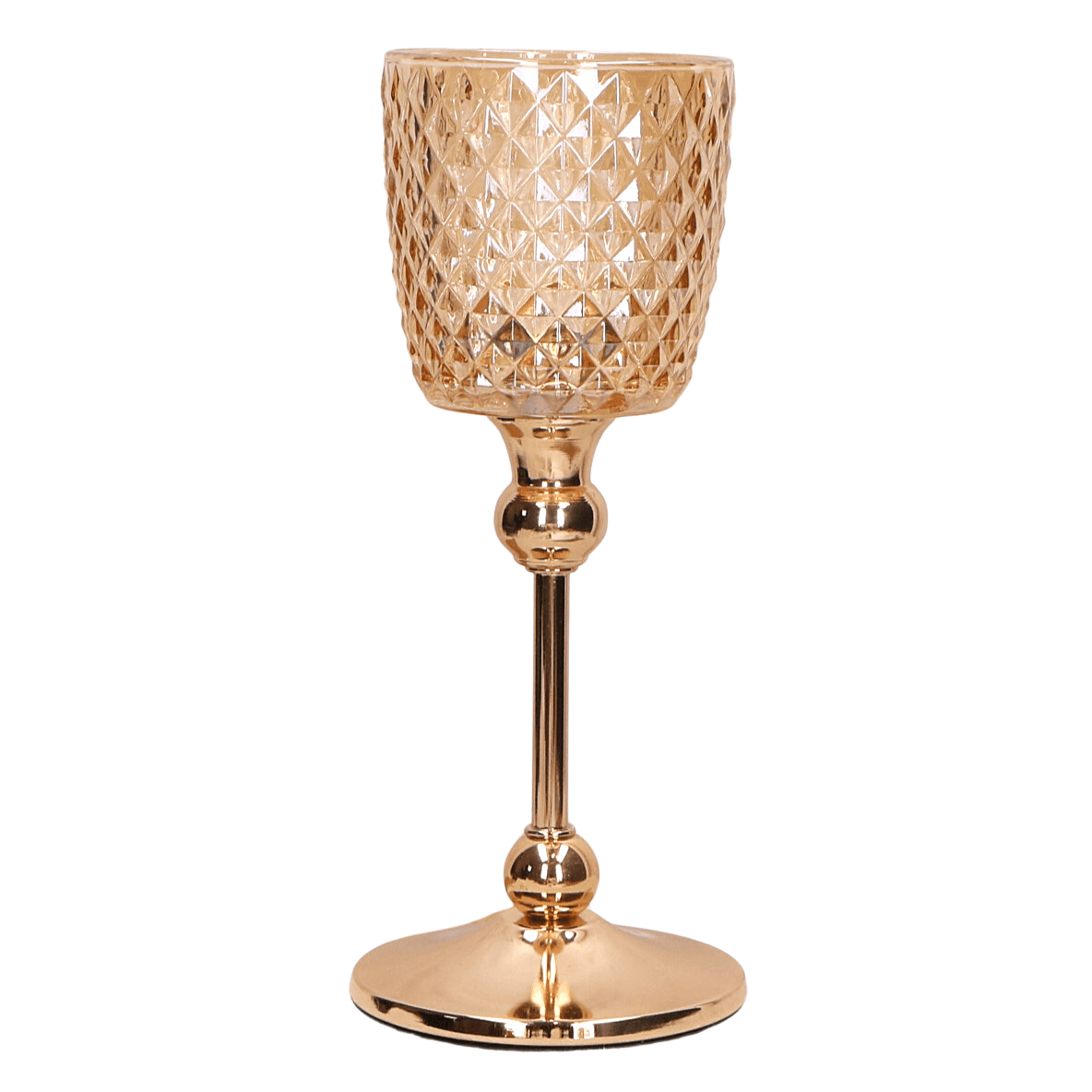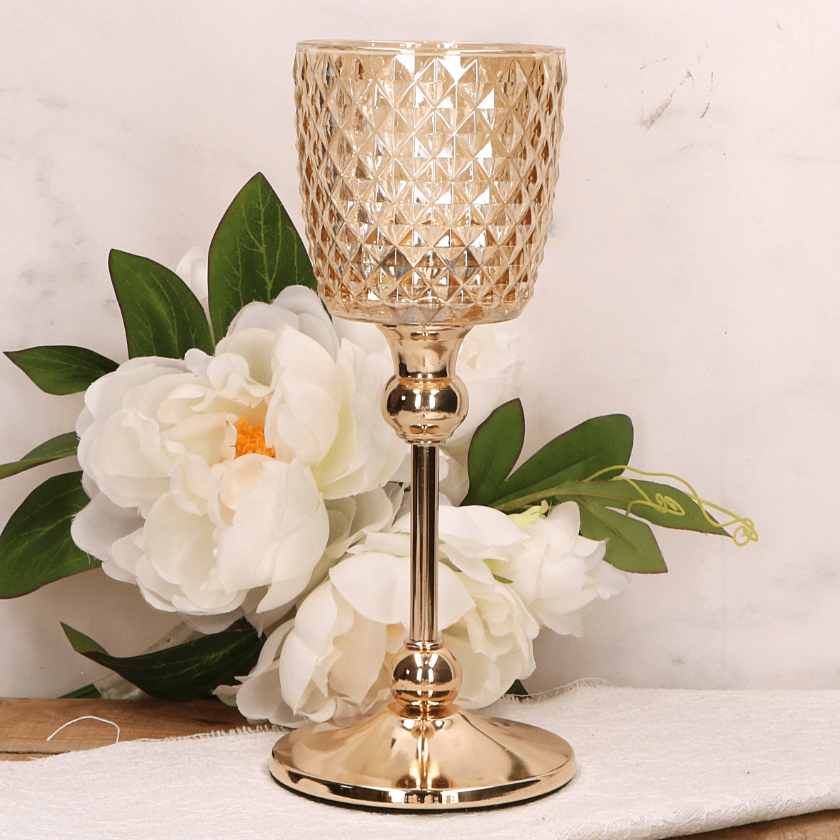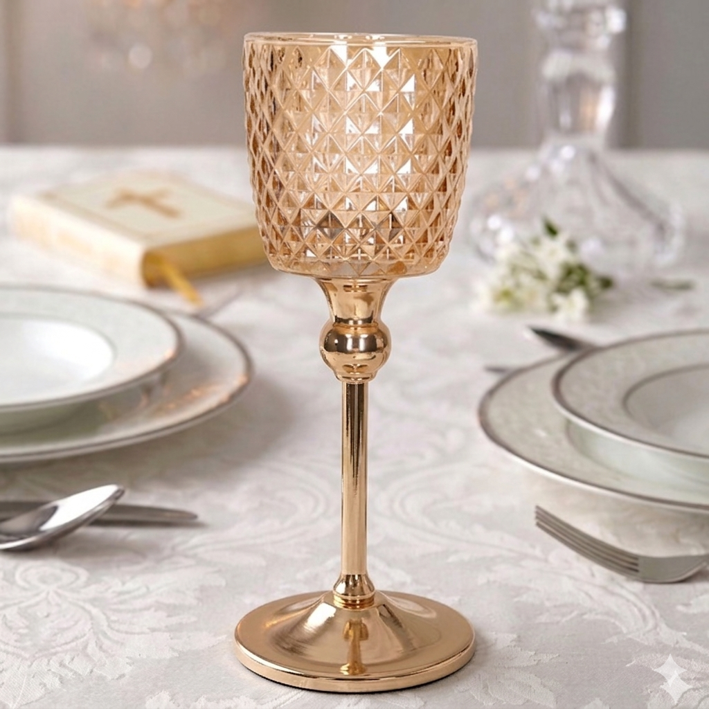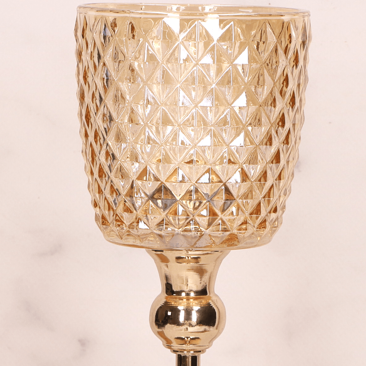 Odkryj piękno tego zdobionego świecznika o wysokości 25 cm, który jest kwintesencją elegancji i stylu. Połączenie lśniącego złota z szklanym, diamentowym wzorem klosza tworzy efektowny element dekoracyjny, który rozświetli każde wnętrze subtelnie rozpraszającym światłem. Świecznik ten jest idealnym wyborem dla osób ceniących sobie klasykę z nutą luksusu.