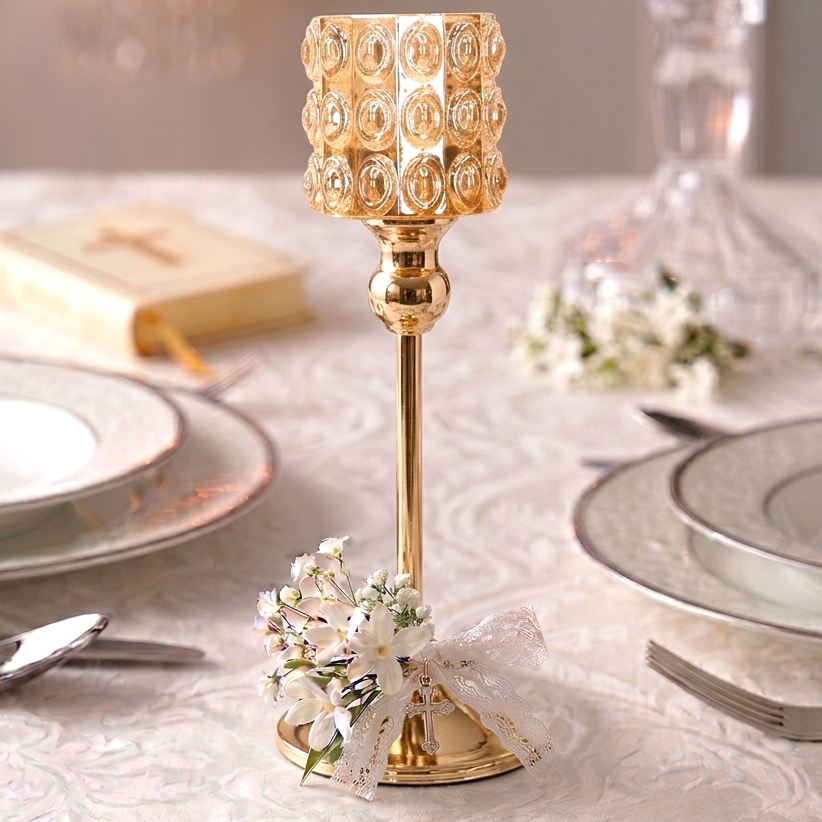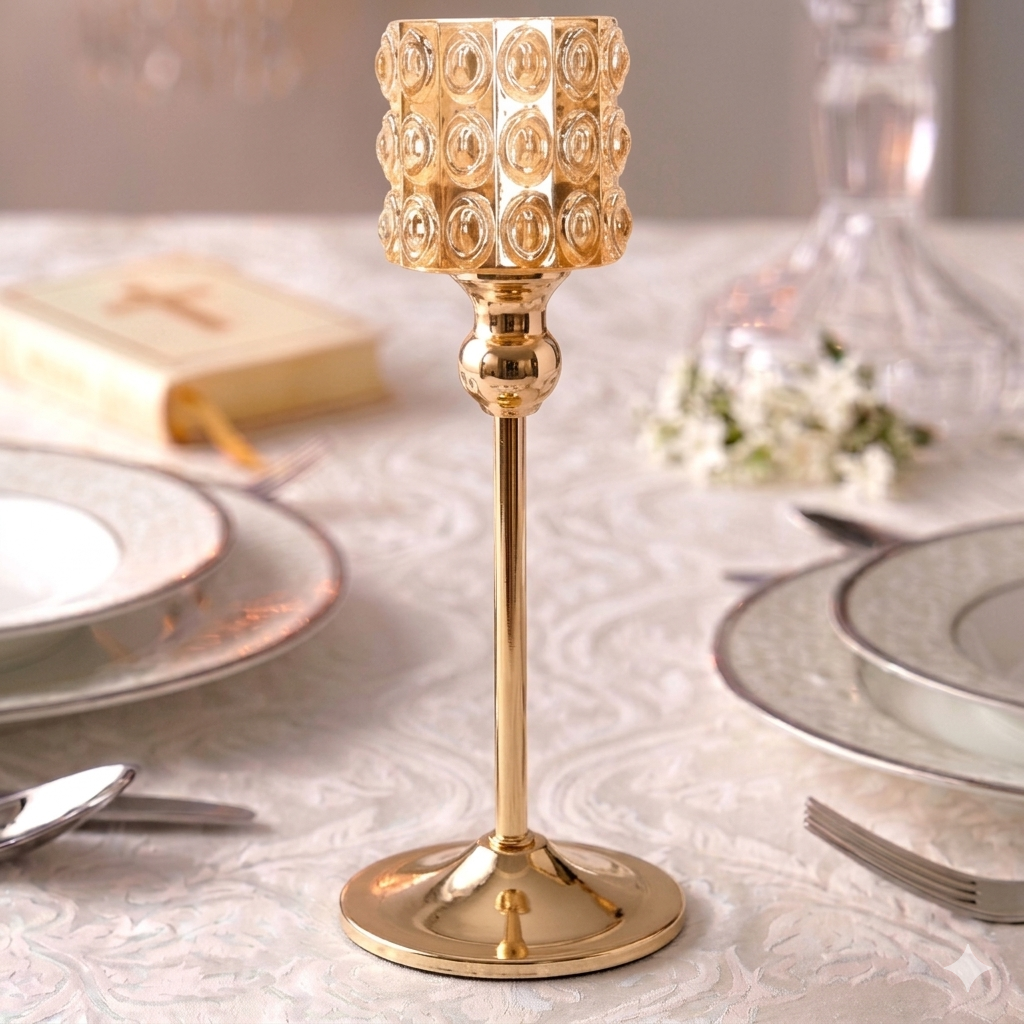 Ten elegancki świecznik o wysokości 28 cm jest synonimem klasy i wyrafinowania. Wykonany z materiałów najwyższej jakości, prezentuje się niezwykle szlachetnie, dodając blasku każdemu wnętrzu. Złocisty kolor i bogato zdobiony klosz sprawiają, że jest to przedmiot nie tylko praktyczny, ale również wyjątkowo dekoracyjny. Idealny do stworzenia romantycznej atmosfery czy jako elegancka dekoracja na specjalne okazje.