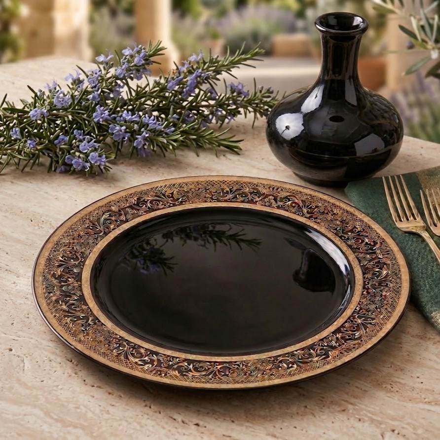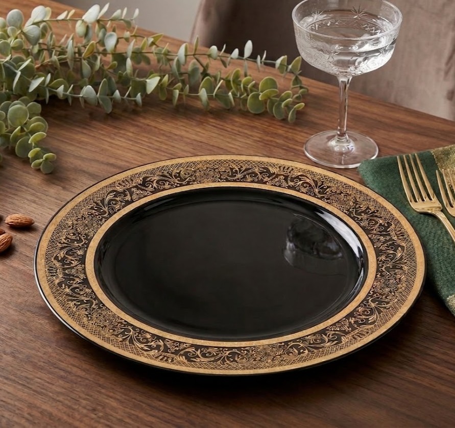 Wzbogać swoją zastawę stołową tym wyjątkowym podtalerzem w kolorze czarno-złotym. Elegancki wzór w stylu barokowym na obrzeżu nadaje talerzowi luksusowy charakter, a głęboka, czarna barwa w połączeniu ze złotymi detalami tworzy wyrafinowany i ponadczasowy design. Talerz doskonale sprawdzi się zarówno na co dzień, jak i podczas wyjątkowych okazji, nadając każdemu posiłkowi odrobinę elegancji. Wykonany z wysokiej jakości materiałów, zapewnia trwałość i odporność na zarysowania, dzięki czemu będzie służył przez długi czas.