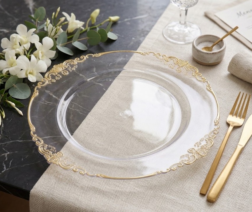 Ekskluzywny talerz podtalerz, który ze swoją przezroczystą powierzchnią i delikatnym, złotym zdobieniem, doda blasku każdej uroczystości. Idealnie pasuje do eleganckich obiadów, bankietów oraz innych formalnych przyjęć.