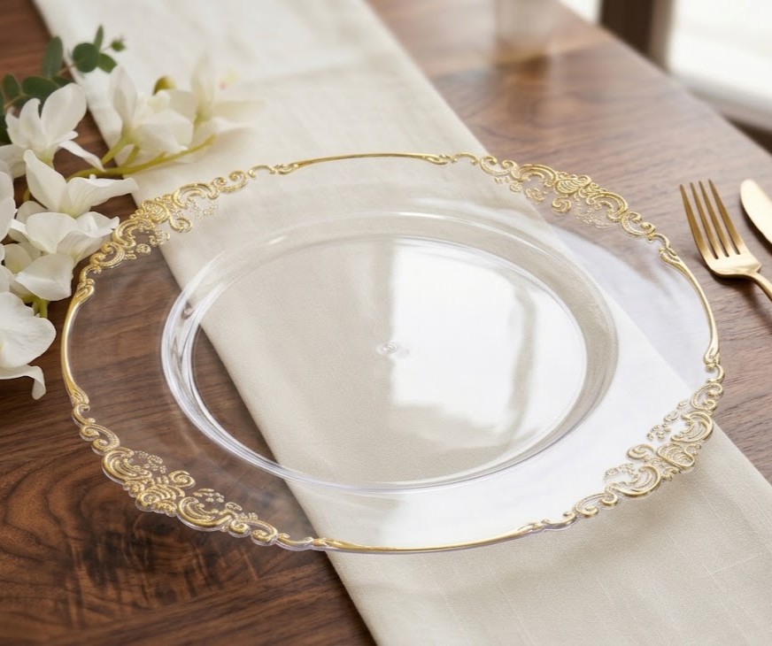 Talerz Podtalerz Transparentny z Ozdobnym Złotym Wzorem