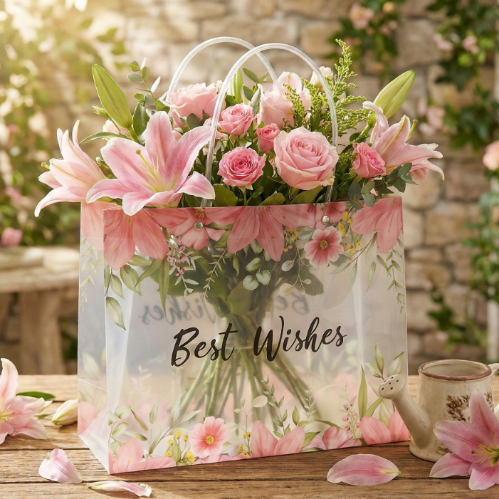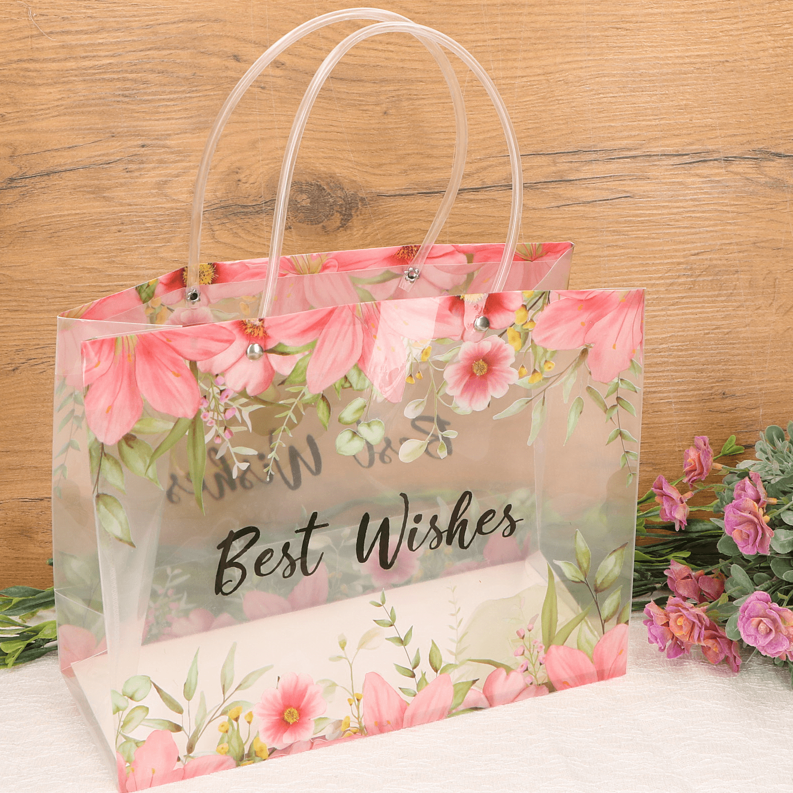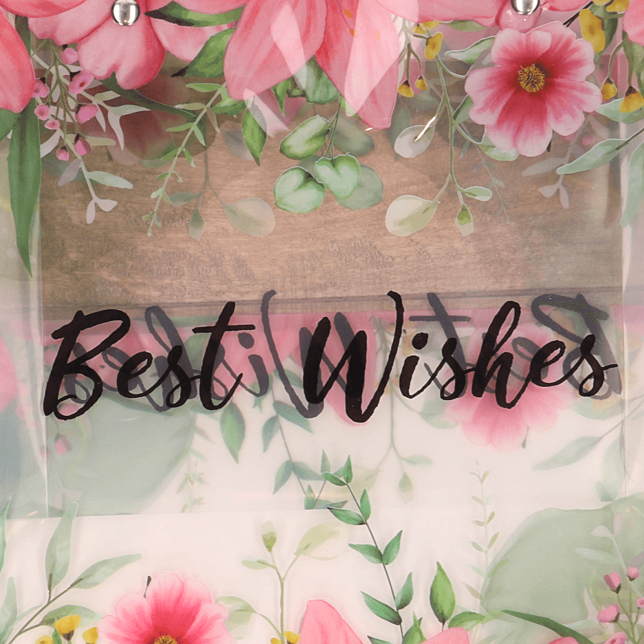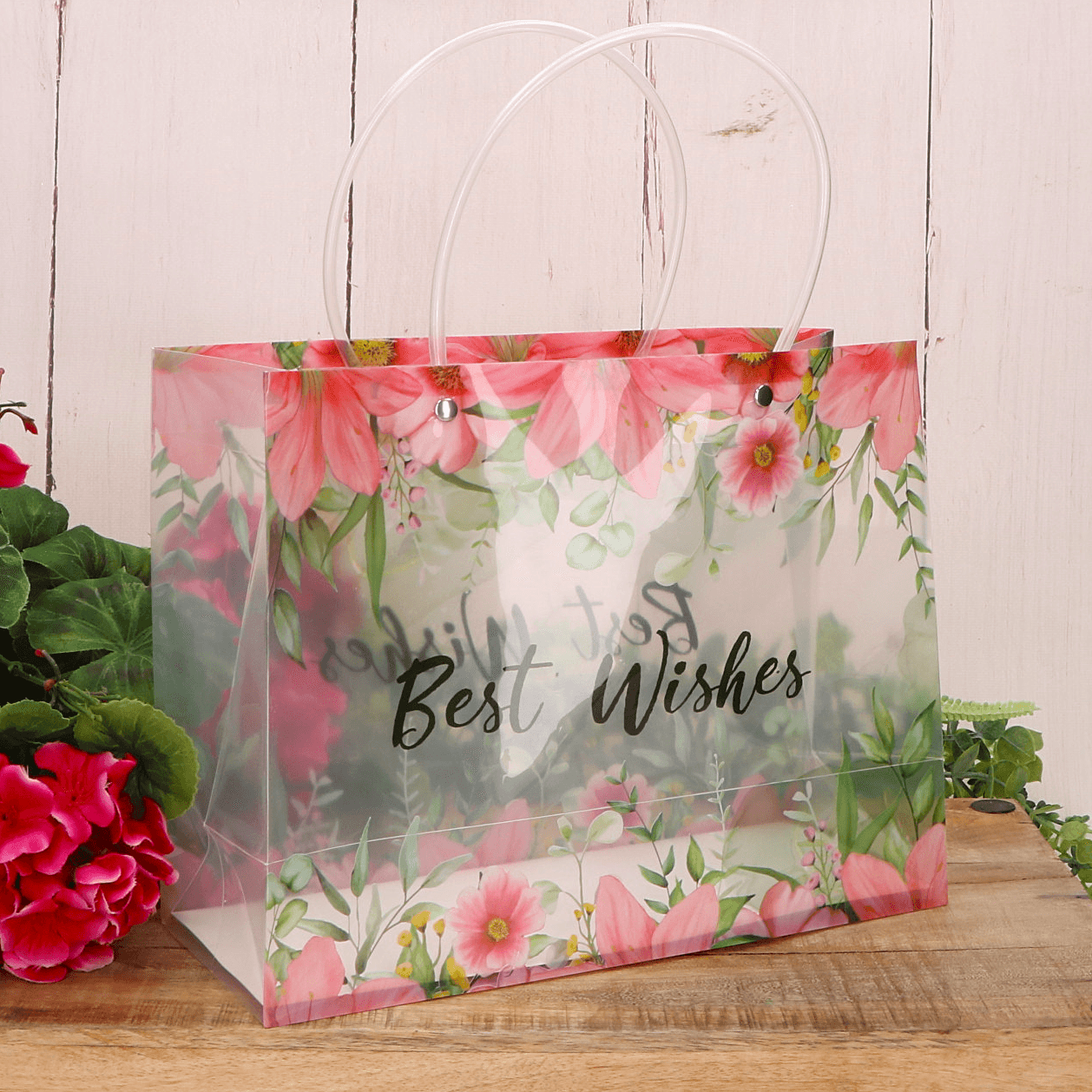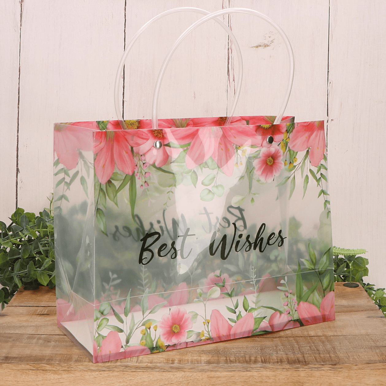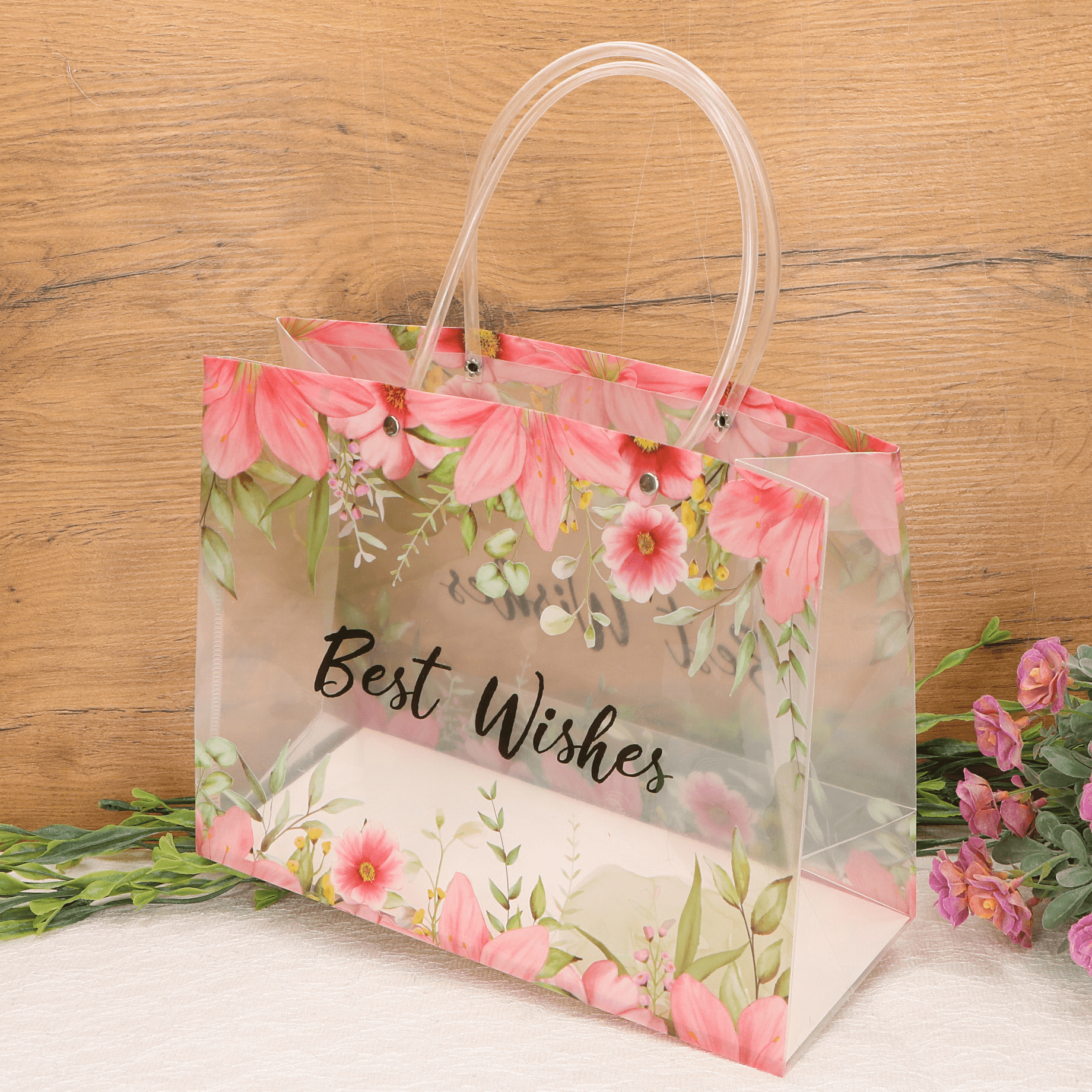 Przepiękna torebka na kwiaty z inskrypcją "Best Wishes" to idealne połączenie funkcjonalności i estetycznego designu. Doskonale sprawdzi się jako opakowanie na prezent lub elegancki sposób na przetransportowanie świeżych kwiatów. Kwiatowy wzór w żywych kolorach i przezroczyste elementy dodają uroku, a solidne rączki gwarantują wygodne użytkowanie. Niezależnie od okazji, ta torebka będzie eleganckim dodatkiem, który podkreśli piękno każdej kompozycji kwiatowej.