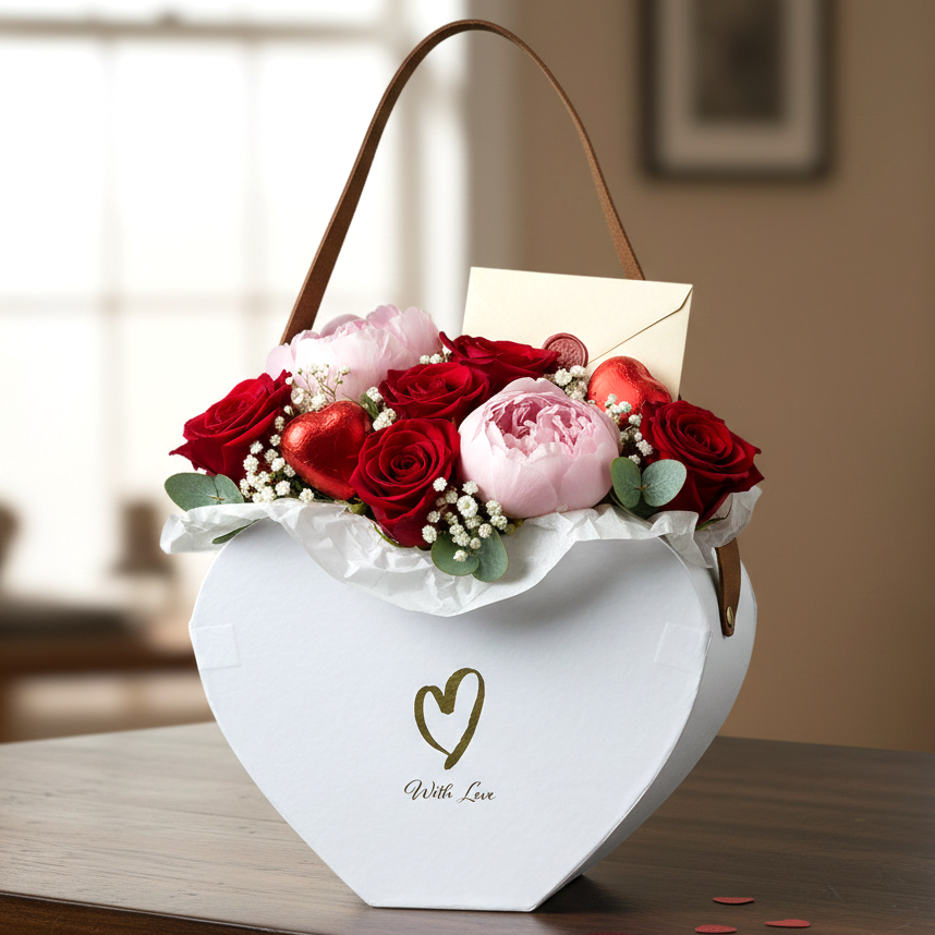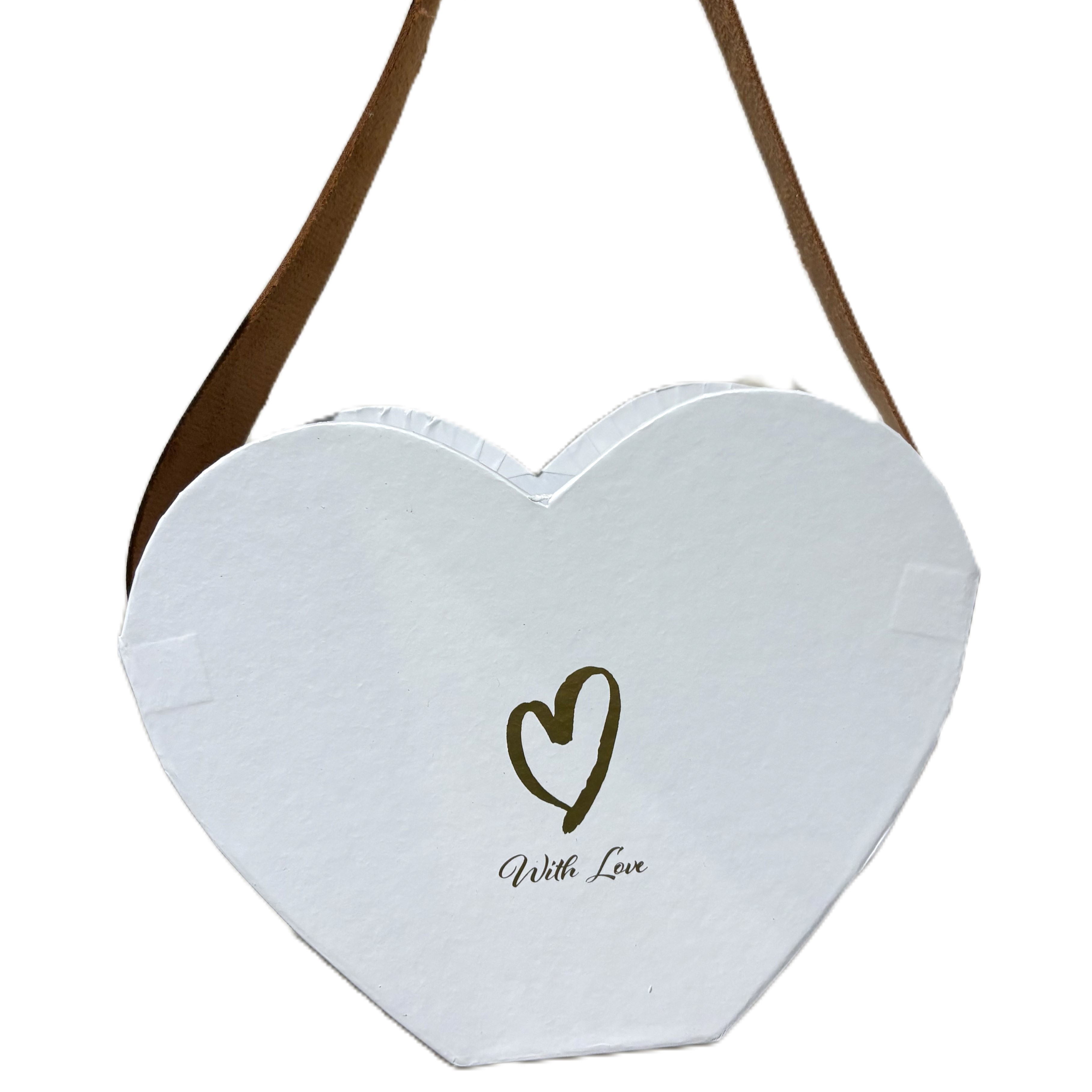 Elegancka papierowa torebka w kształcie serca to idealny wybór na wyjątkowe okazje – Walentynki, Dzień Kobiet, rocznicę czy ślub. Wykonana z wysokiej jakości papieru w klasycznym białym kolorze, ozdobiona złotym nadrukiem „With Love” oraz praktycznym brązowym uchwytem, stanowi stylowe i funkcjonalne opakowanie na drobny upominek, kwiaty lub słodycze. Jej romantyczny design i oryginalna forma sprawiają, że każda wręczona niespodzianka nabierze wyjątkowego charakteru. Idealna do użytku indywidualnego, jak i w kwiaciarniach oraz butikach prezentowych. Świetnie prezentuje się jako dekoracja lub część kompozycji florystycznej.