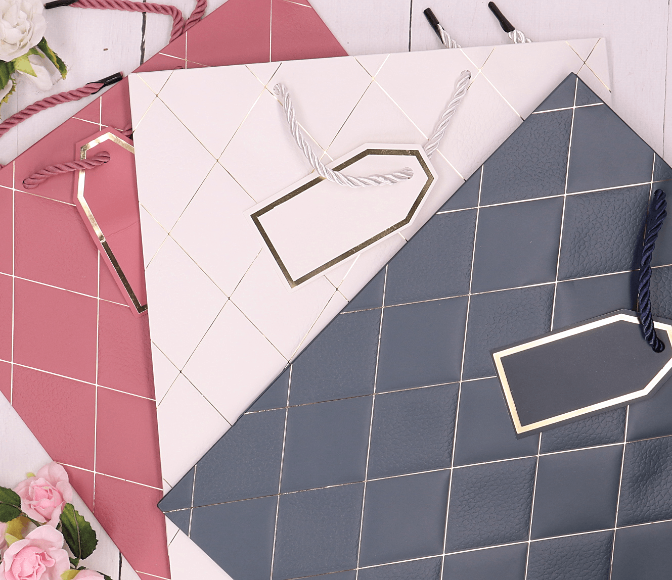 Celebrowanie wyjątkowych momentów wymaga wyjątkowej oprawy. Nasze papierowe torebki prezentowe dostępne w czterech eleganckich kolorach: różowym, biały, szarym i niebieskim, każda z nich wzbogacona o stylowy, geometryczny wzór, doskonale odzwierciedlają szyk i elegancję. Wybierz torebkę, która najlepiej pasuje do okazji i osobowości obdarowywanej osoby.