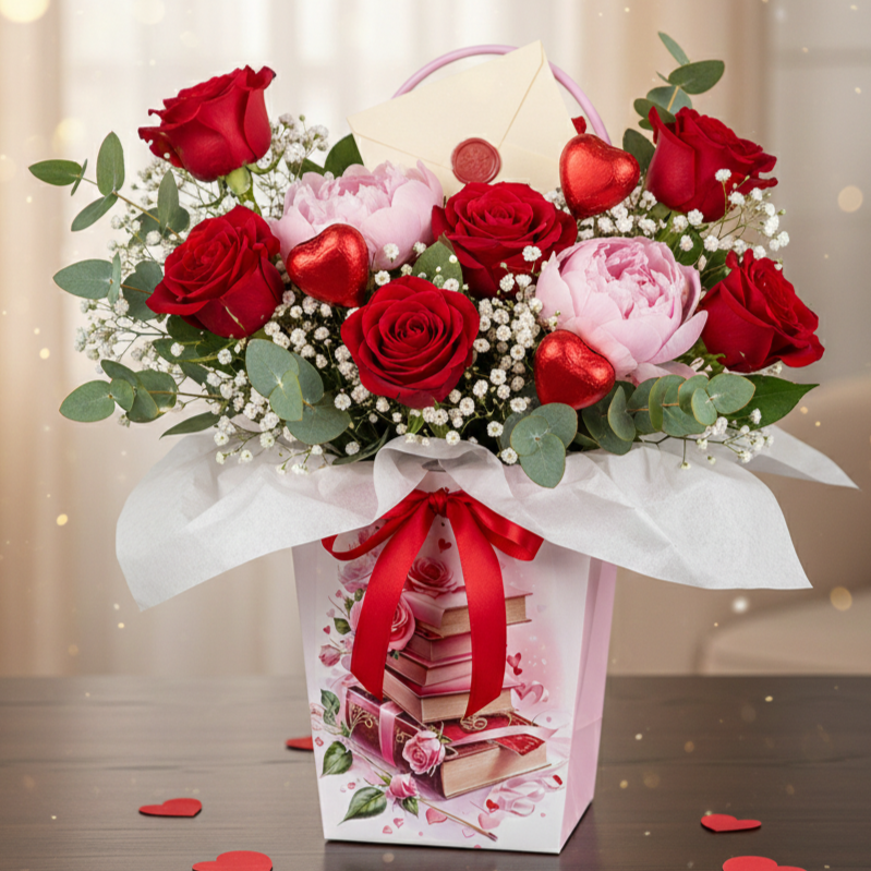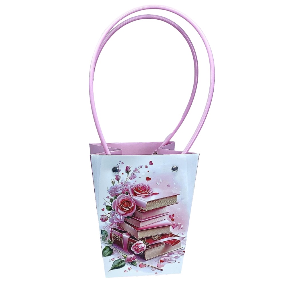 Urocza papierowa torebka typu flowerbox z romantycznym nadrukiem róż i książek to doskonałe opakowanie na kwiaty, słodycze lub drobne upominki. Wykonana z wytrzymałego papieru, zachwyca pastelową kolorystyką i estetycznym, kobiecym wzorem, który idealnie wpisuje się w klimat Walentynek, Dnia Kobiet czy urodzin. Różowe uchwyty dodają całości lekkości i elegancji, czyniąc torebkę praktycznym i dekoracyjnym rozwiązaniem. To idealna propozycja zarówno dla osób prywatnych, jak i kwiaciarni oraz butików z prezentami. Podkreśl wyjątkowy charakter każdego podarunku dzięki temu efektownemu opakowaniu.