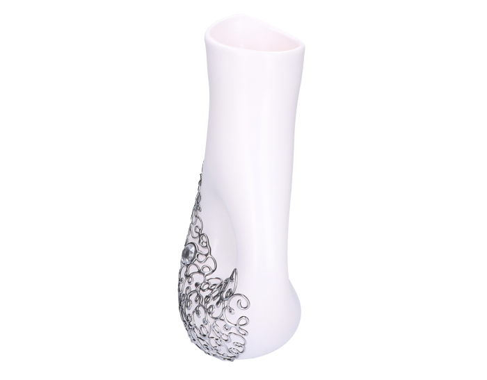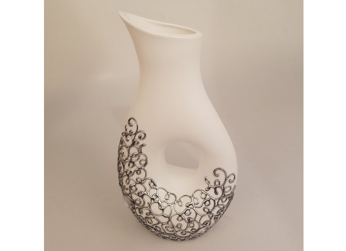 Ceramika jest wypalana dzięki czemu w swojej konsystencji pozostaje mocnym materiałem, trwałym i dość odpornym na stłumecznia w porównaniu do kreacji wyrzeźbionych z gipsu. Wykończenie produktu jest natomiast pokryte srebrnym zdobionym klejem. Dodatkowo wazon jest impregnowany, dzięki czemu śmiało można napełniać go wodą.