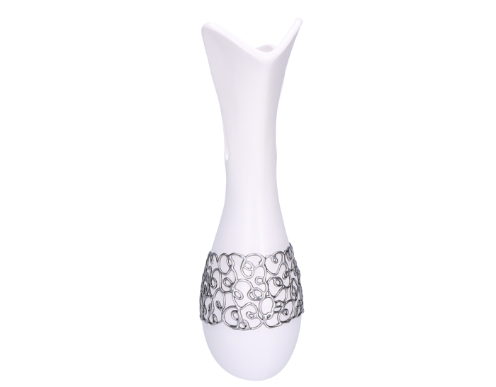 Ceramika jest wypalana dzięki czemu w swojej konsystencji pozostaje mocnym materiałem, trwałym i dość odpornym na stłumecznia w porównaniu do kreacji wyrzeźbionych z gipsu. Wykończenie produktu jest natomiast pokryte srebrnym zdobionym klejem. Dodatkowo wazon jest impregnowany, dzięki czemu śmiało można napełniać go wodą.