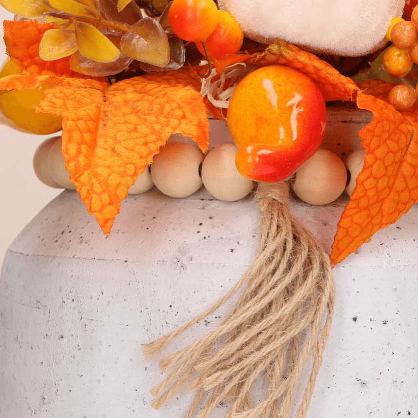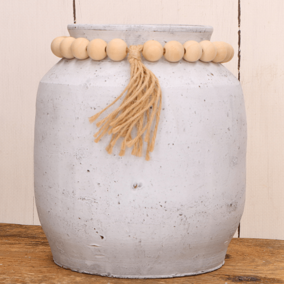 Wazon cementowy biały przecierany z koralikami i frędzlem 11 x 18 cm – stylowa dekoracja w klimacie boho