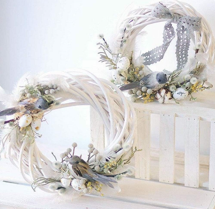 - Ozdoby są przyczepiane do wianka za pomocą kleju, nici lub drutów