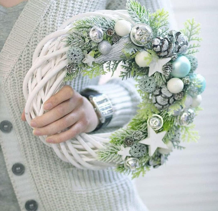- Ozdoby są przyczepiane do wianka za pomocą kleju, nici lub drutów