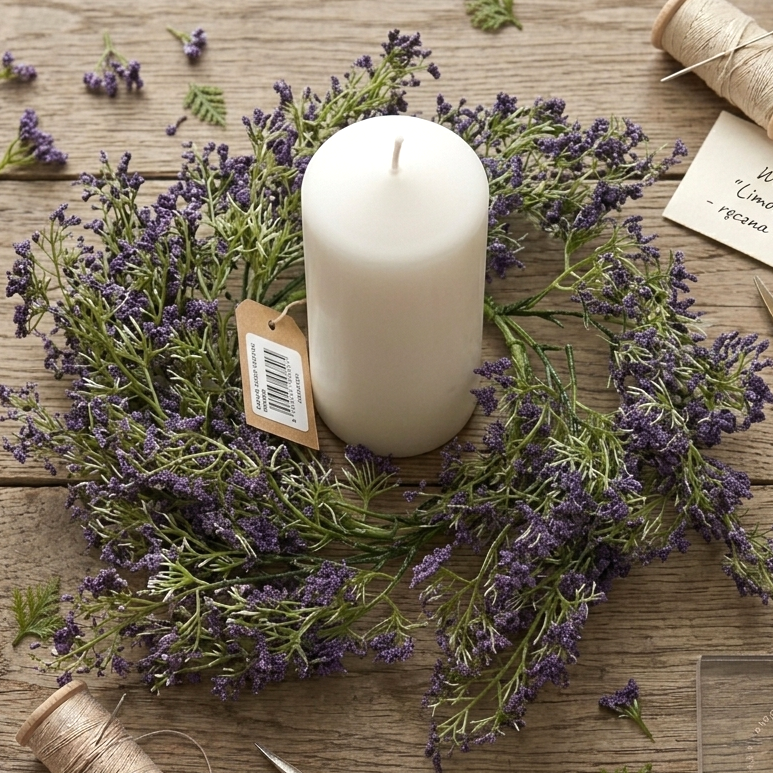 Subtelny wianek dekoracyjny wykonany z drobnych,fioletowych kwiatków to idealna propozycja dla osób ceniących lekkość i naturalne piękno. Delikatne gałązki w połączeniu z zielonymi elementami tworzą harmonijną i świeżą kompozycję, która doskonale sprawdzi się jako ozdoba drzwi, ściany lub stołu. Wianek świetnie wpisuje się w styl boho, rustykalny oraz klasyczny, dodając wnętrzu elegancji i przytulnego charakteru. Dzięki starannemu wykonaniu zachowuje swój estetyczny wygląd przez długi czas i nie wymaga pielęgnacji. To także doskonały pomysł na stylowy i uniwersalny prezent.