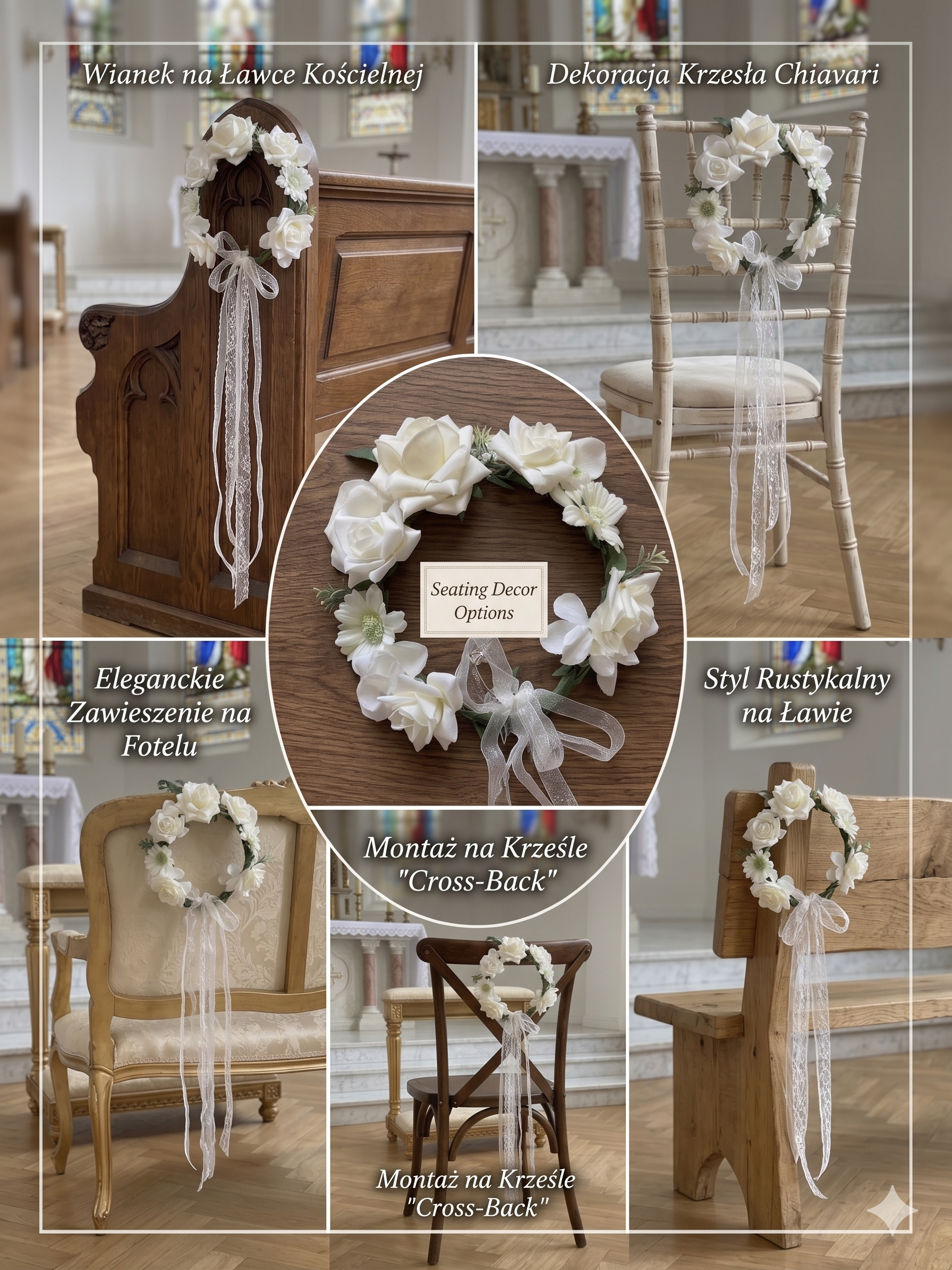 - Uniwersalny wianek dekoracyjny – pasuje na krzesła, stoły i ściany
