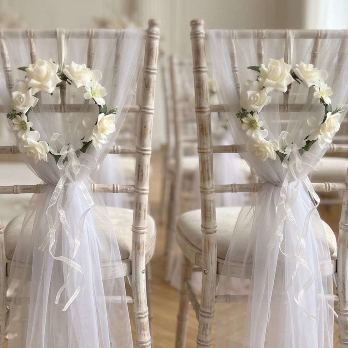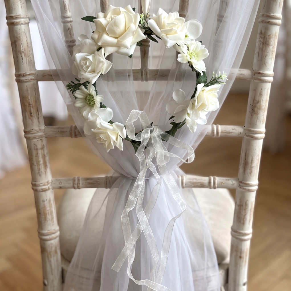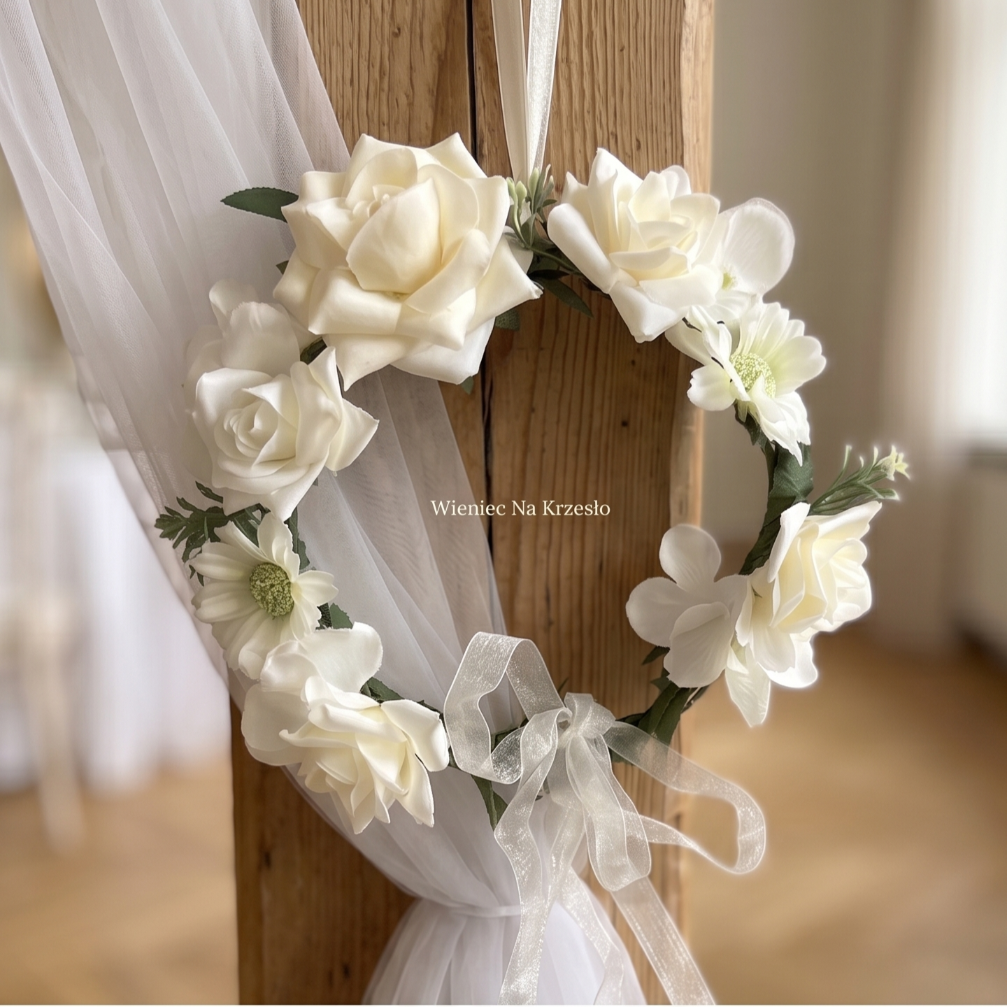 Subtelny i stylowy wianuszek dekoracyjny to idealna ozdoba na Komunię, Chrzest lub ślub. Wykonany z wysokiej jakości sztucznych kwiatów, zachwyca delikatnością oraz naturalnym wyglądem. Doskonale sprawdzi się jako dekoracja krzesła, stołu lub element aranżacji sali.Jest łatwy w montażu i pięknie się układa. Ten romantyczny wianek podkreśli wyjątkowy charakter uroczystości i doda jej klasy.Pasuje do każdej aranżacji i stylu przyjęcia.