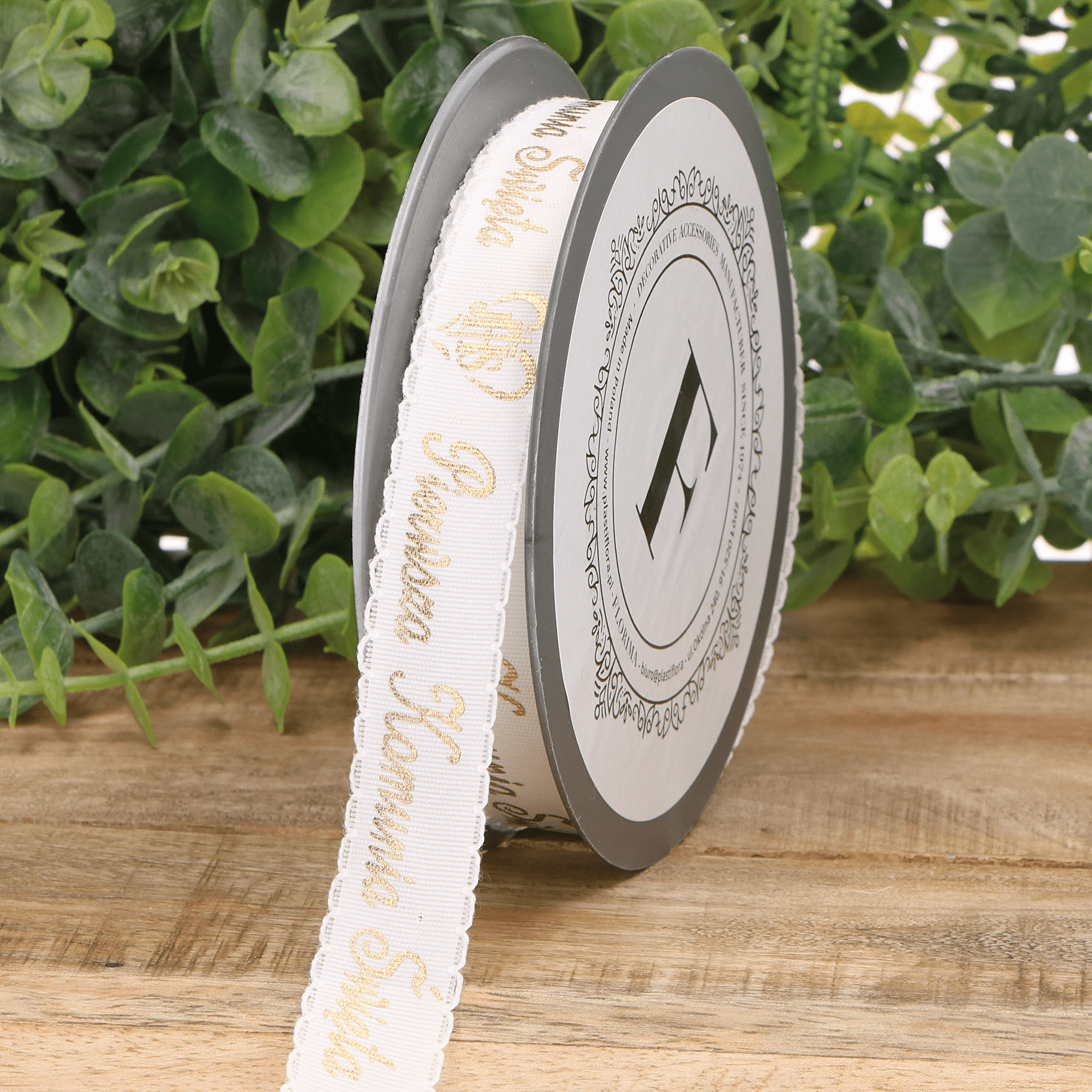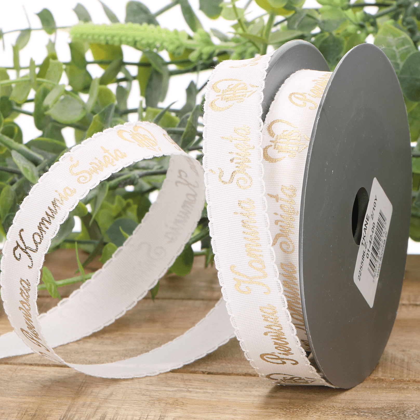 Wstążka z motywem komunijnym. Biało-złota kolorystyka oczaruje najbliższych i pozwoli stworzyć bazę do przygotowania całej aranżacji na Komunii dziecka. Wstążki możesz użyć do zaproszeń, do ozdoby stołu czy świecy.