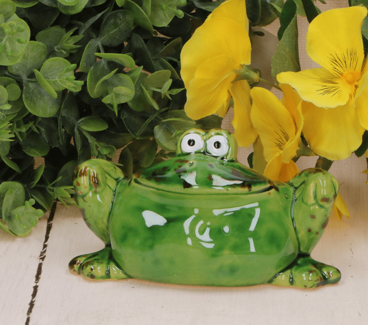 Oto urocza, zielona ceramiczna żaba. Radosne oczy i szeroki uśmiech żaby dodają jej uroku, a jej wygląd świetnie wpasuje się w każdy kąt domu, od przedpokoju po dziecięcy pokój.