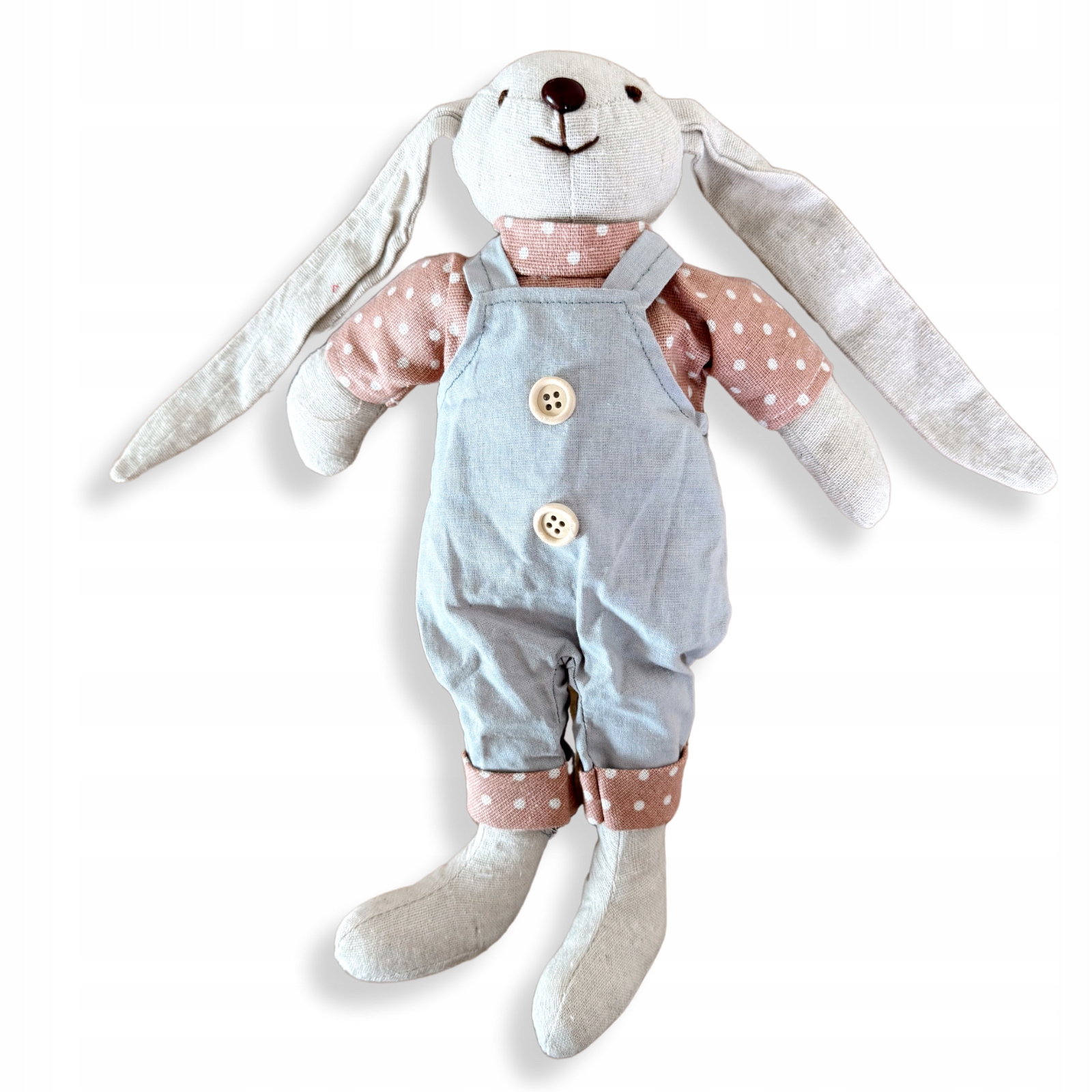 Zajączek Wielkanocny - chłopczyk w niebieskich ogrodniczkach 33cm