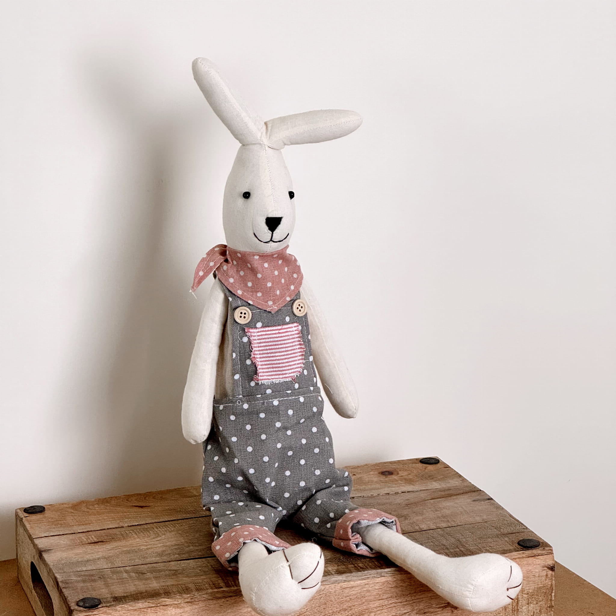 Zajączek - chłopczyk w ogrodniczkach 62cm