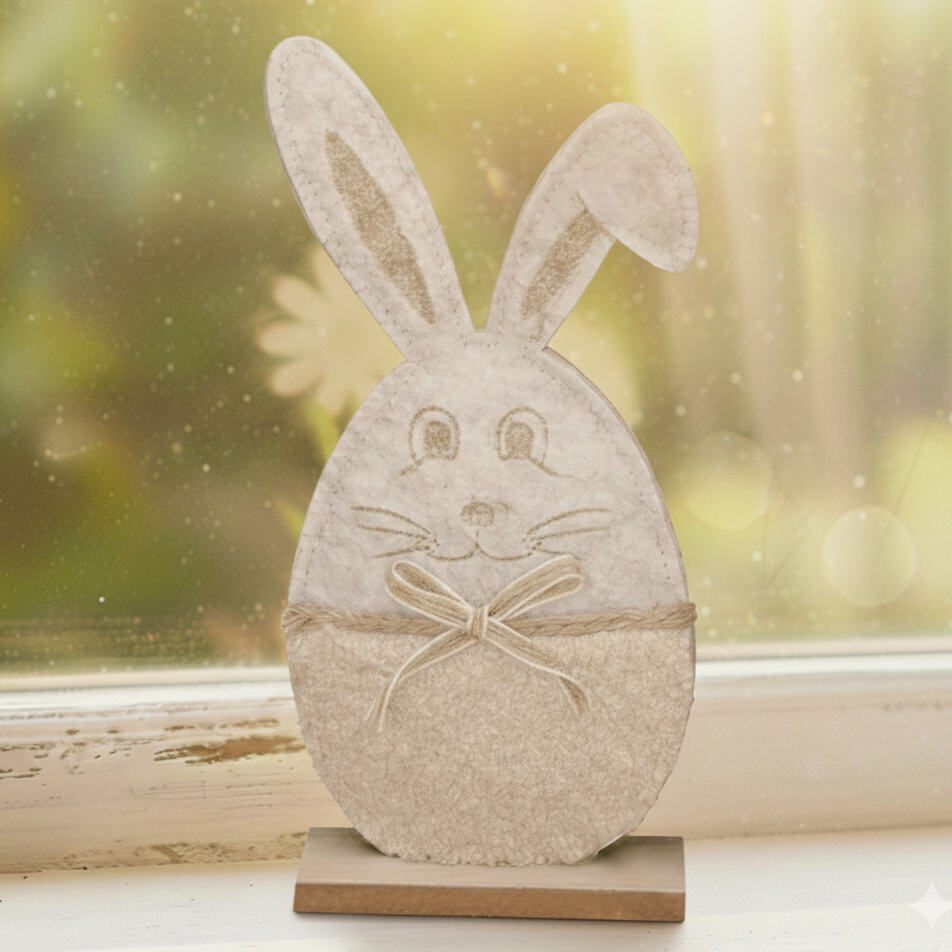 Ten uroczy filcowy zajączek to idealna dekoracja na Wielkanoc, która wniesie do wnętrza ciepły, wiosenny klimat. Wykonany z miękkiego filcu, ozdobiony jutowym sznurkiem i futerkowym akcentem, prezentuje się naturalnie i stylowo. Osadzony na stabilnej drewnianej podstawce, świetnie nadaje się do postawienia na stole, komodzie, parapecie czy świątecznym stroiku. Delikatne, neutralne kolory sprawiają, że doskonale komponuje się z innymi dekoracjami w stylu rustykalnym lub boho. To doskonały wybór dla miłośników naturalnych ozdób i rękodzieła.