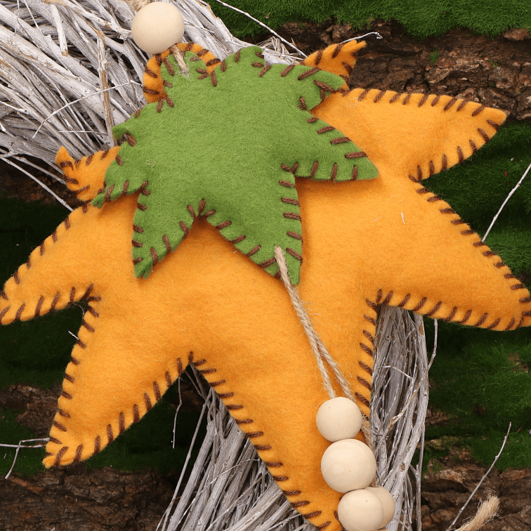 Oryginalna zawieszka w kształcie liścia w odcieniach zieleni i pomarańczy to doskonały dodatek do świątecznych i zimowych aranżacji wnętrz. Wykonana z miękkiego filcu i ozdobiona naturalnym sznurkiem oraz drewnianymi koralikami, wprowadza ciepły i przytulny klimat. Zawieszka świetnie sprawdzi się na choince, drzwiach, w oknie lub jako część świątecznego stroika. Starannie wykończone brzegi nadają dekoracji rękodzielniczy charakter, który przypadnie do gustu miłośnikom stylu boho i eko. Produkt jest lekki i łatwy do zawieszenia, a jego uniwersalna kolorystyka sprawia, że będzie pasować do różnych kompozycji świątecznych i zimowych.