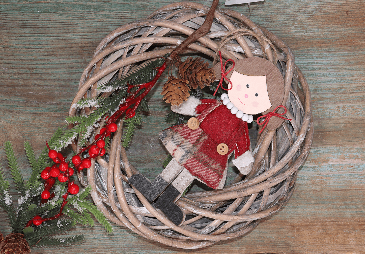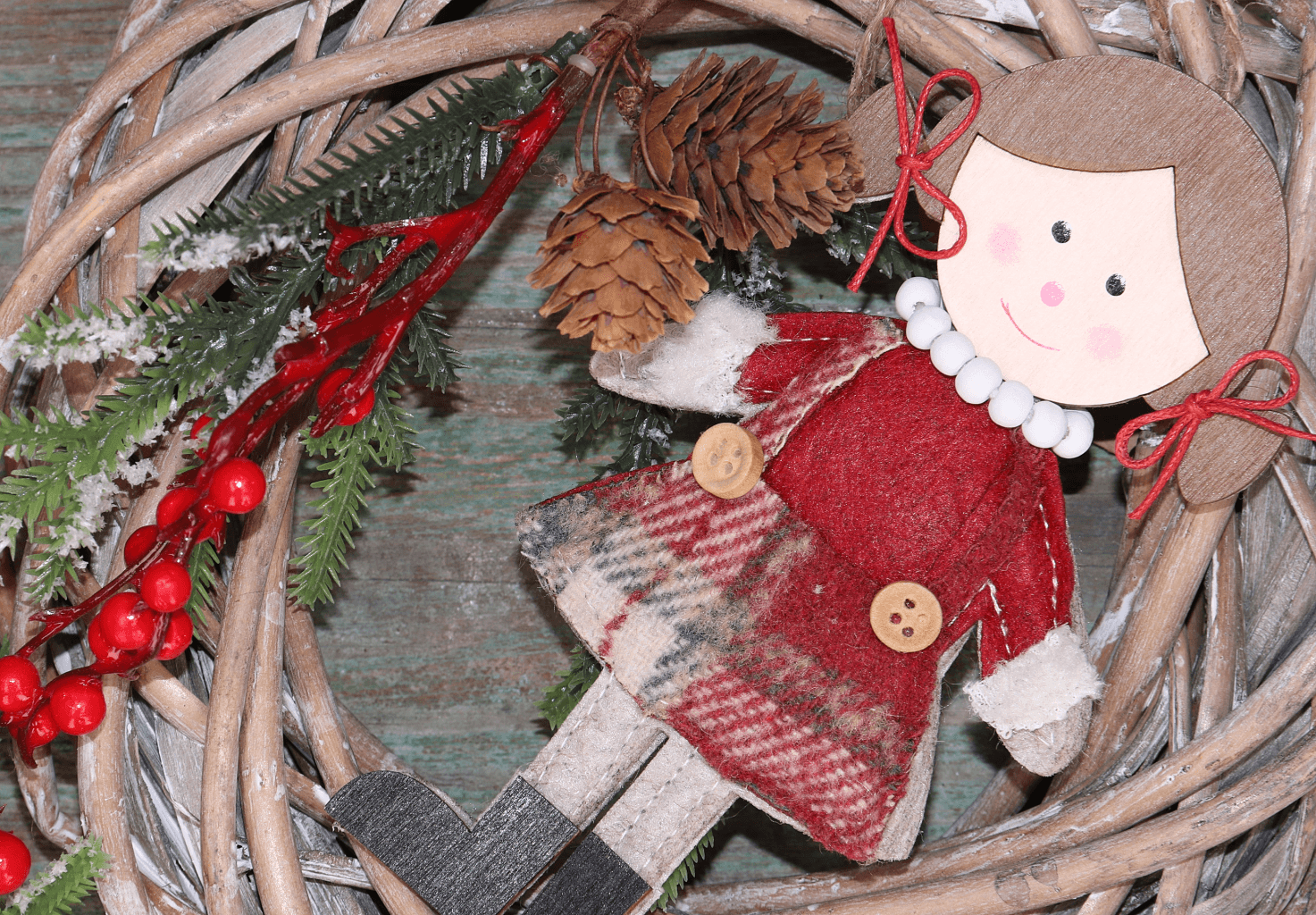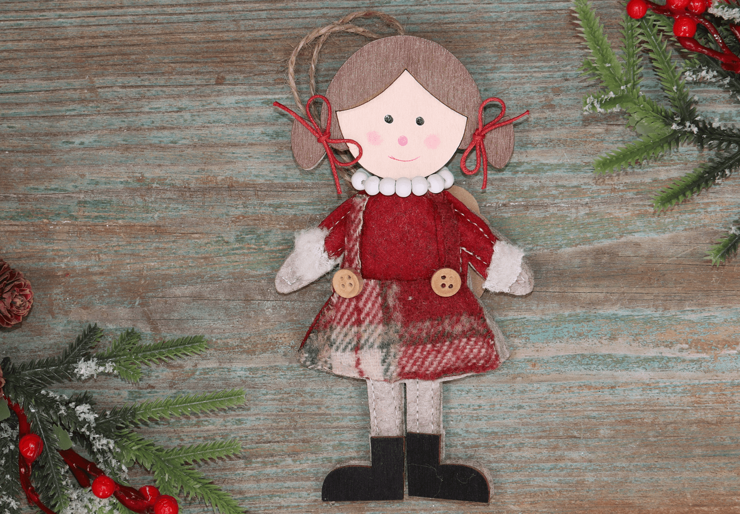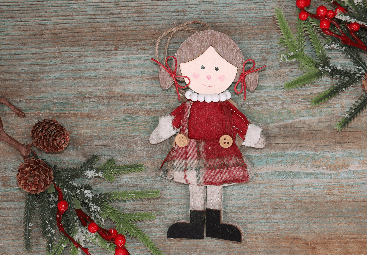 Urocza zawieszka świąteczna w kształcie dziewczynki to wyjątkowa dekoracja, która doda Twojemu wnętrzu przytulnego klimatu na czas Świąt Bożego Narodzenia. Postać została wykonana z połączenia drewna i miękkiej tkaniny, co nadaje jej naturalny wygląd i wyjątkowy urok. Dziewczynka ubrana jest w ciepłą spódniczkę w kratę, sweterek z białymi mankietami oraz ozdobne kokardki przy kucykach. Zawieszka idealnie sprawdzi się na choince, w oknie lub jako uroczy dodatek do prezentu. Świetna do wnętrz w stylu rustykalnym, skandynawskim i vintage.