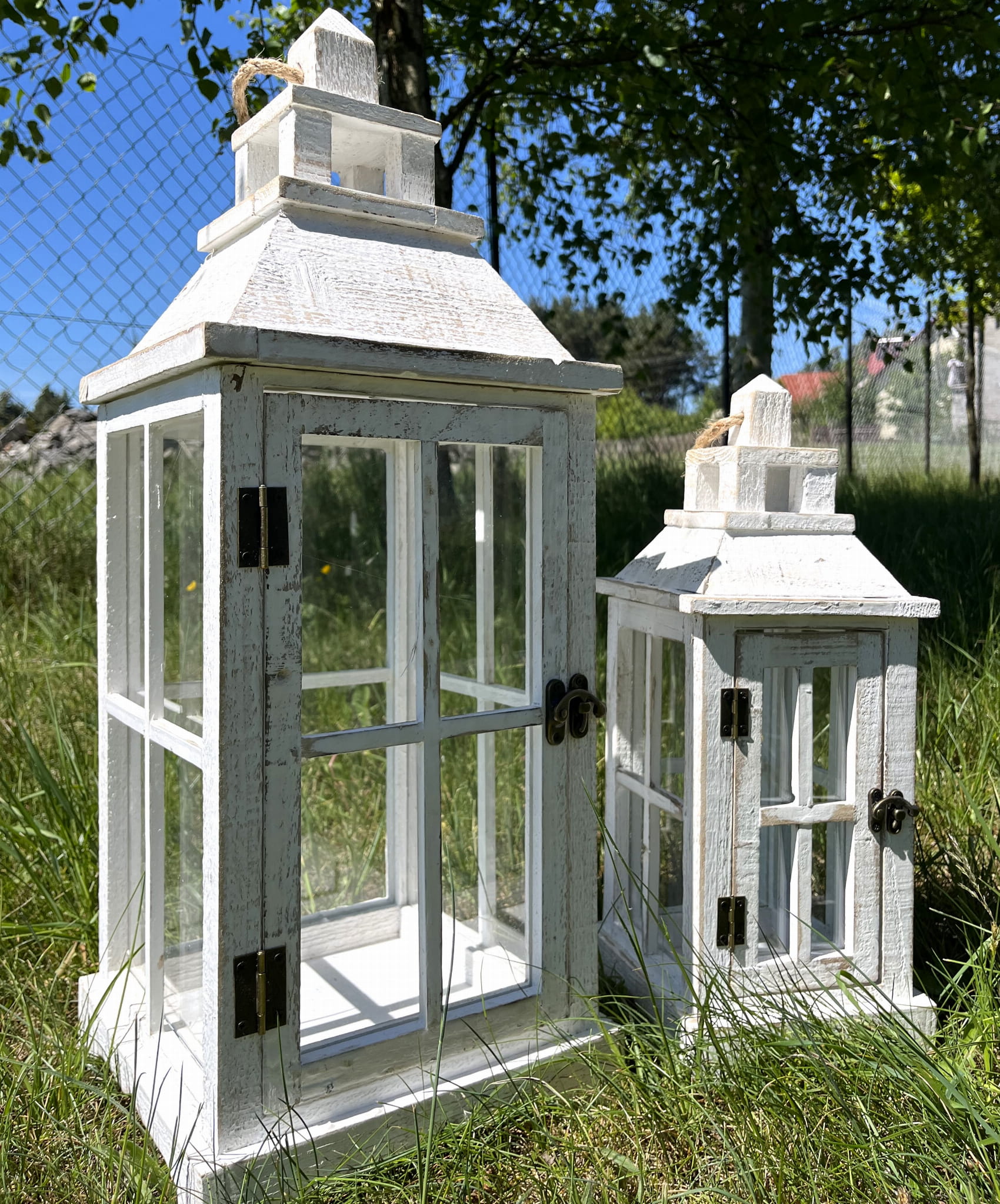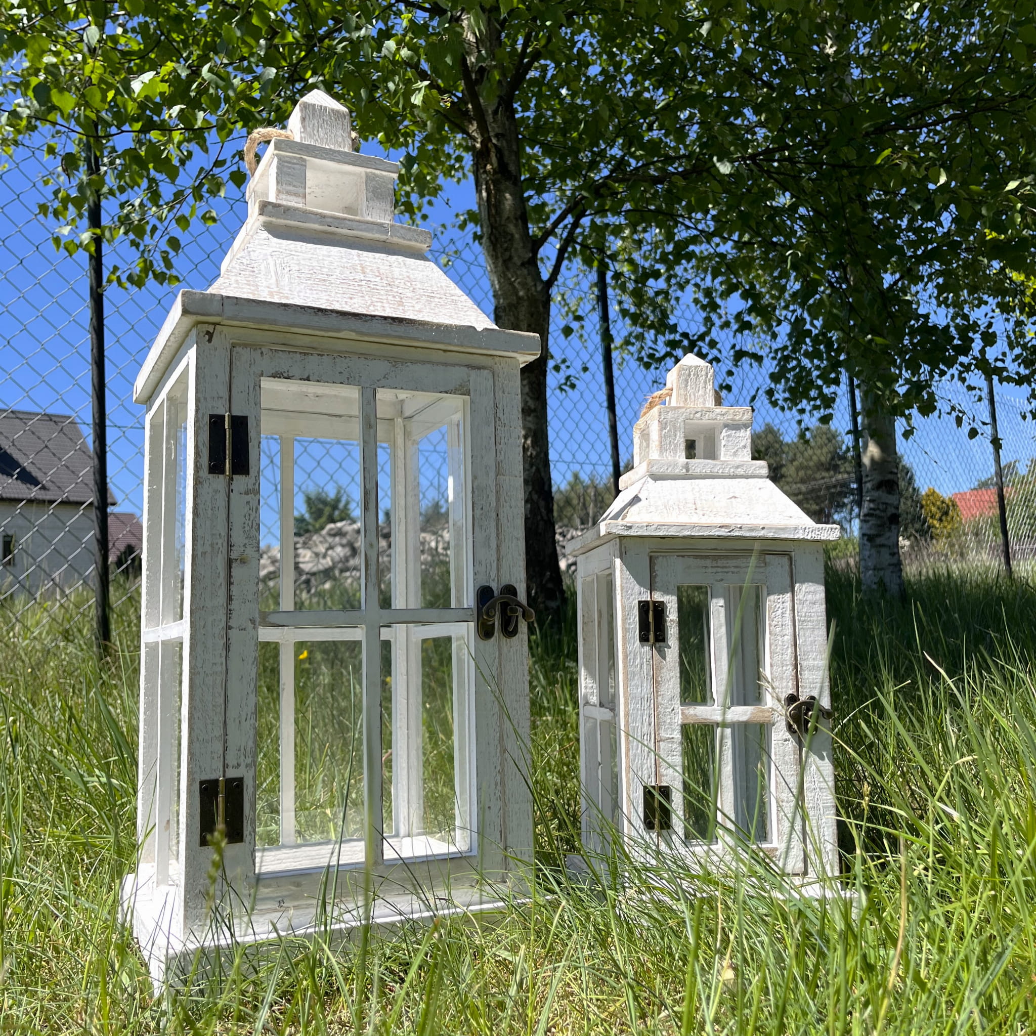 Elegancki zestaw dwóch drewnianych latarni w stylu rustykalnym to idealna propozycja dla miłośników klimatycznych dekoracji. Wykonane z wysokiej jakości drewna w przecieranym, białym wykończeniu, doskonale wpisują się w styl skandynawski, vintage oraz boho. Przeszklone ścianki pięknie eksponują światło świec lub lampek LED, tworząc ciepłą i przytulną atmosferę zarówno w domu, jak i w ogrodzie. Latarnie świetnie sprawdzą się jako dekoracja tarasu, balkonu, salonu czy ścieżki ogrodowej. Praktyczne drzwiczki oraz uchwyty ułatwiają użytkowanie i przenoszenie, a solidna konstrukcja zapewnia trwałość na długi czas.