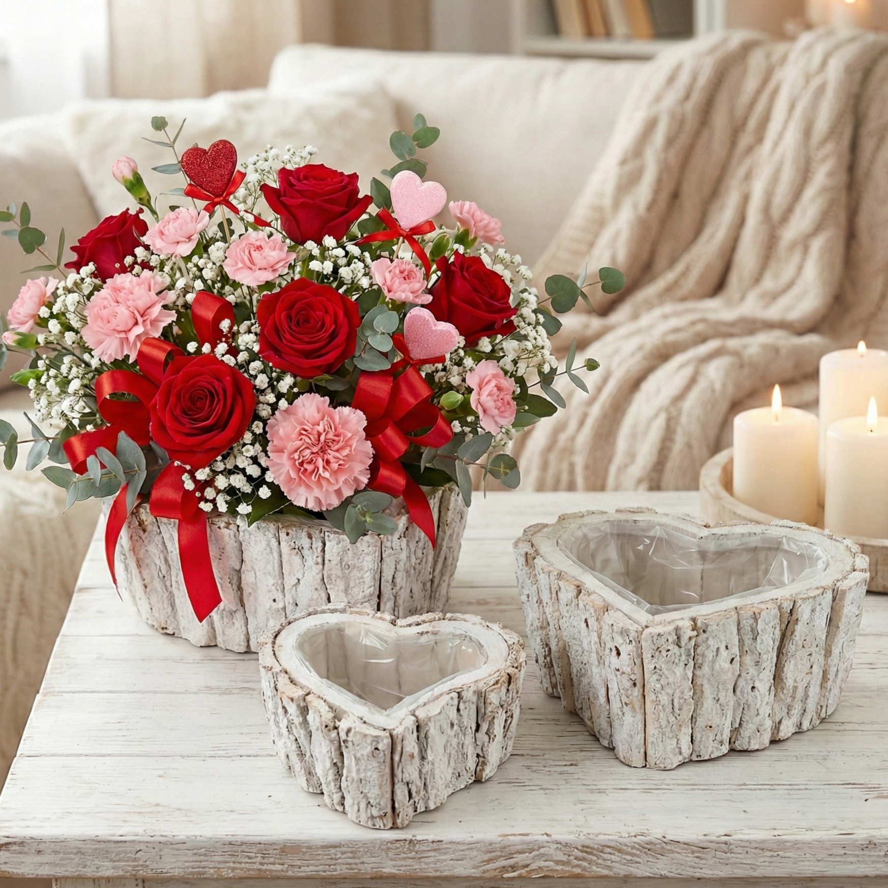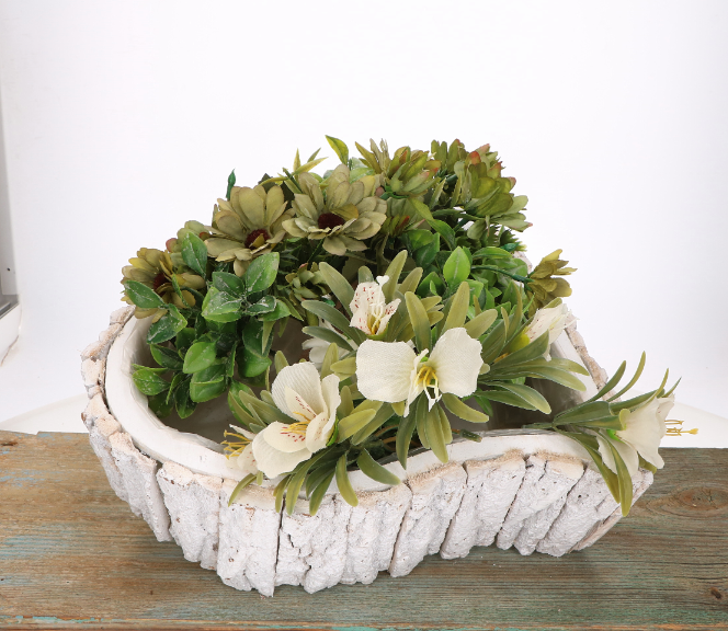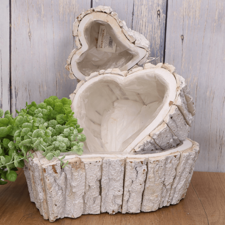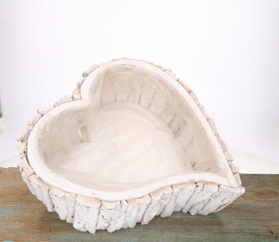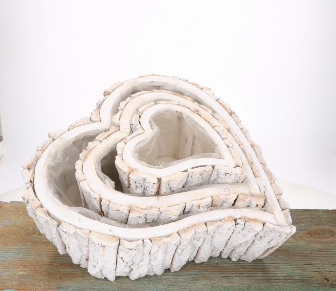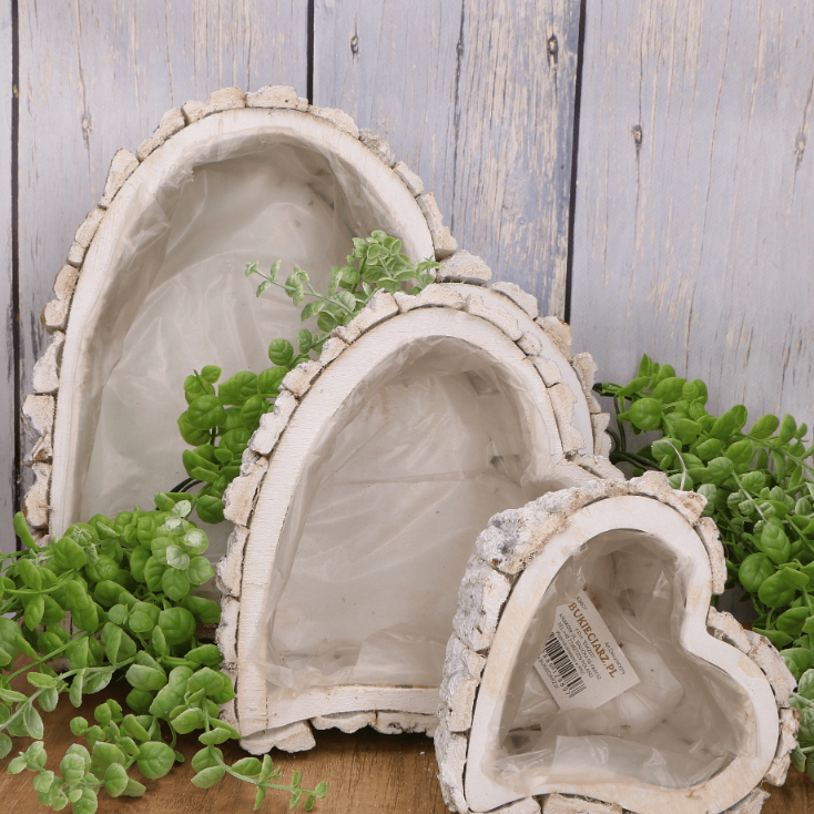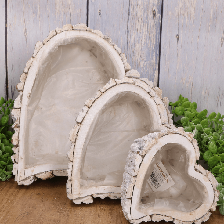 Ten uroczy zestaw trzech osłonek w kształcie serca wykonanych z kory to idealna propozycja dla miłośników rustykalnych dekoracji. Białe wykończenie w połączeniu z naturalnym materiałem, jakim jest kora, dodaje osłonkom niepowtarzalnego charakteru. Dzięki uniwersalnemu wyglądowi, osłonki będą doskonałym dodatkiem zarówno do wnętrz, jak i na zewnątrz – świetnie sprawdzą się na tarasie, balkonie czy w ogrodzie. Wnętrze wyłożone folią ochronną pozwala na ich praktyczne wykorzystanie jako osłonki na doniczki, co ułatwia pielęgnację roślin.