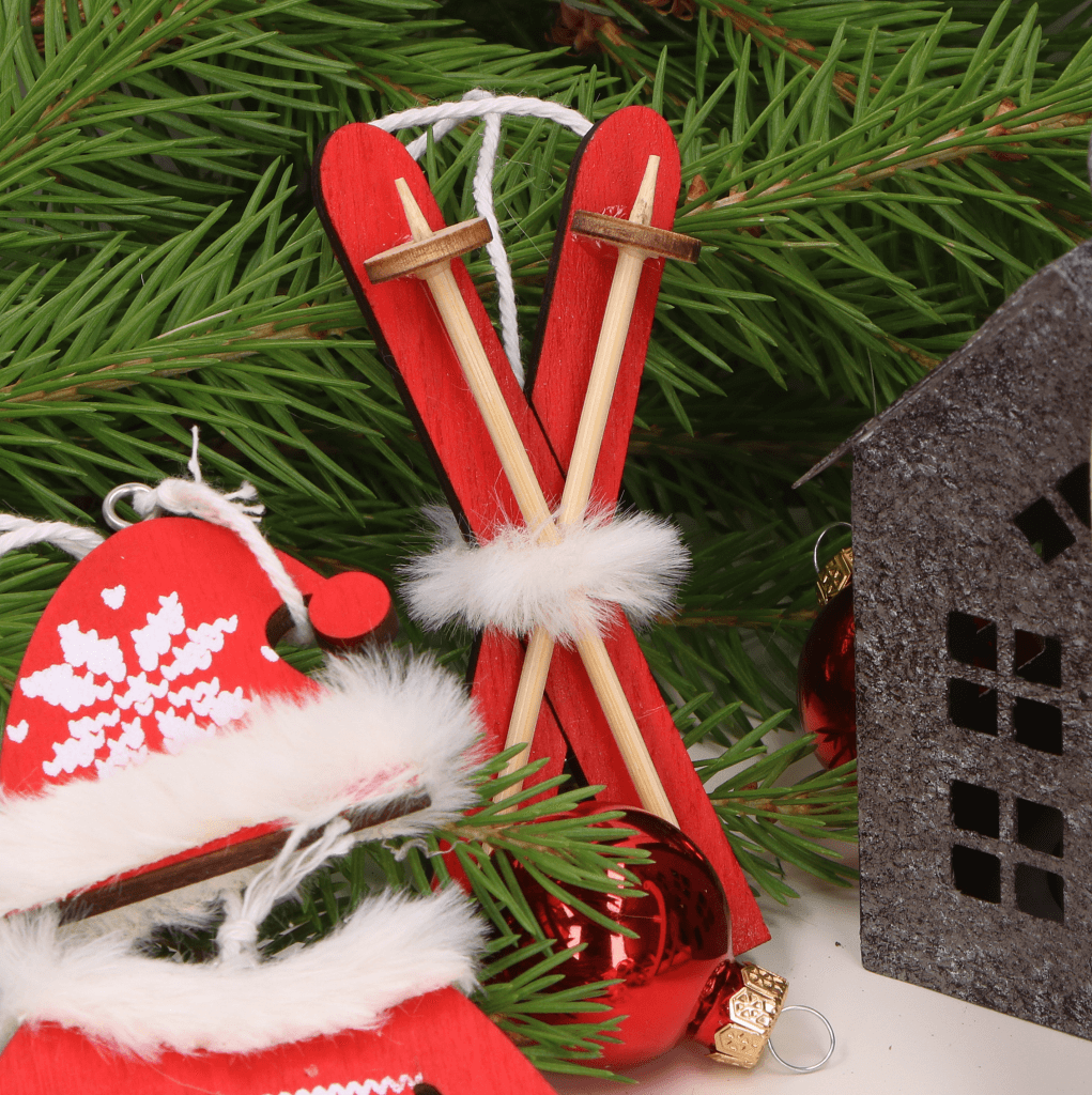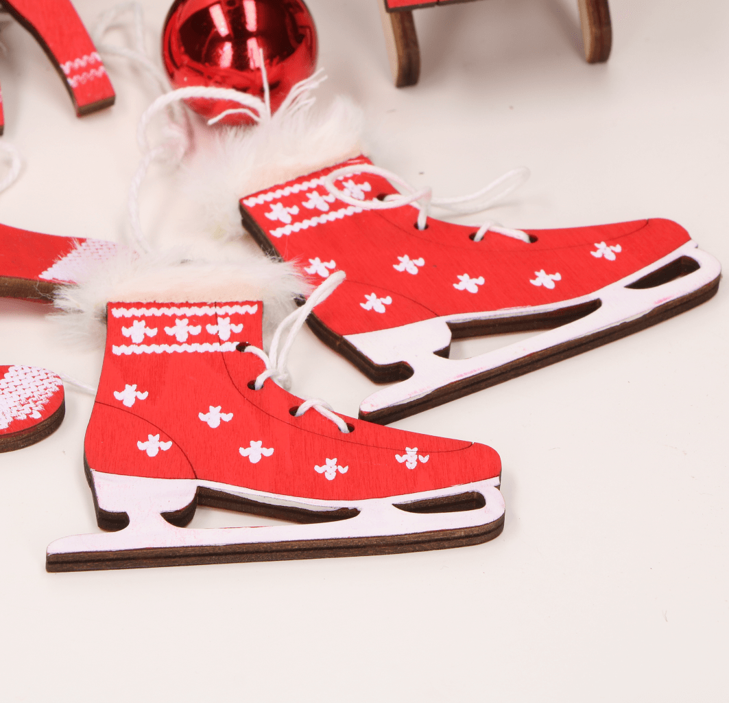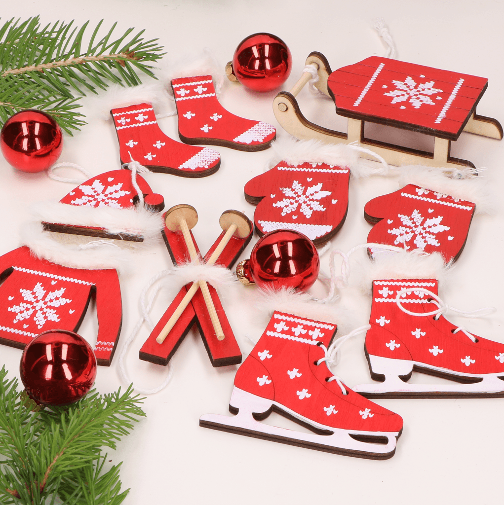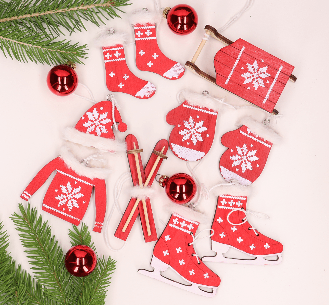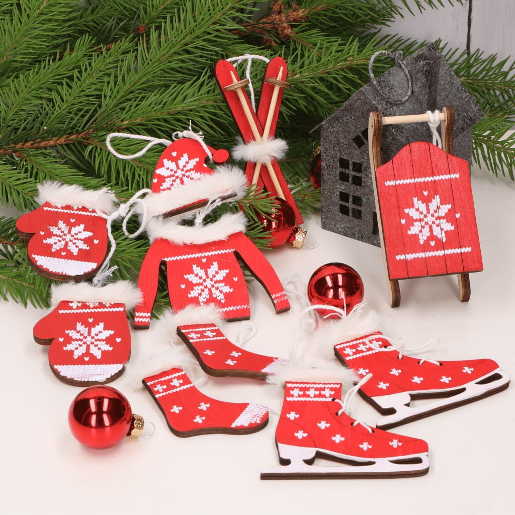Cena za komplet - 6 szt. zawieszek w pudełku (sanki, ubranko, łyżwy, rękawiczki, narty, skarpety)